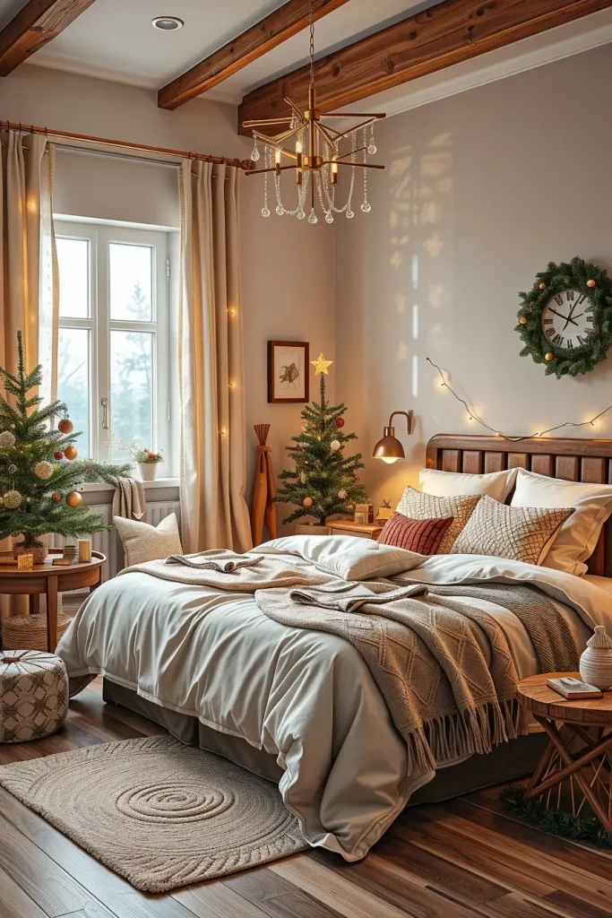As far as decor is concerned, I employ a mix of natural materials, wood, and minor metallics. The decoration of the small Christmas tree in the corner, with the minimum ornaments, is inviting. Another suggestion I would make is to have a small tray on the nightstand with a candle, pine sprigs, and a holiday mug to make it look comfortable.