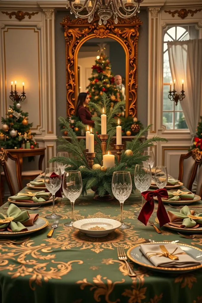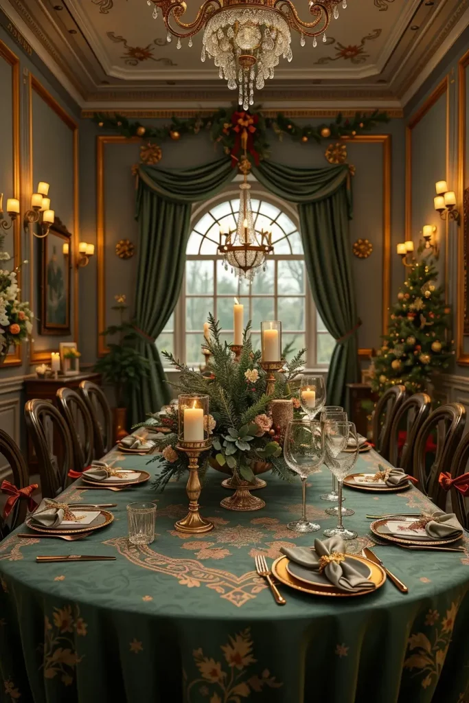 Christmas dining room is where the memories are created and thus the decorations should be jovial and deliberate. I then tend to start with a thick table cloth in deep green, ivory or gold and this can create the tone. Next I pile a center-piece of evergreen boughs and candles and candelabra that are very candelight reflective.