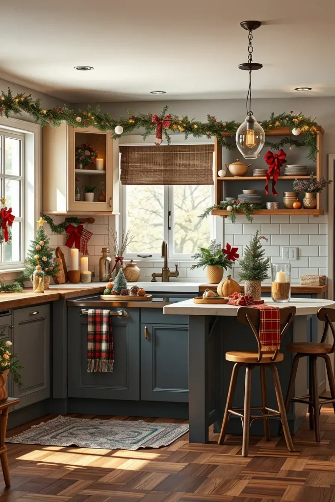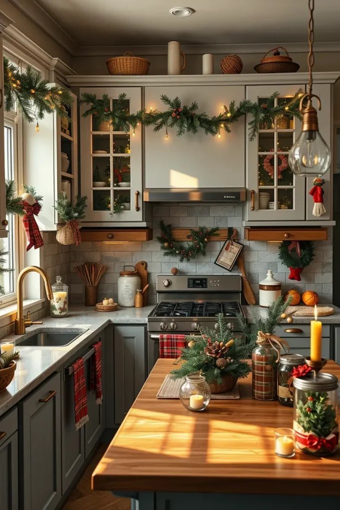 As accessories, I prefer ceramic jars adorned with holiday decorations, plaid runners or wooden cutting boards that are artistically arranged. It is also my favorite to have some scented candles or small fairy lights to create the atmosphere. A bowl of dried oranges, cinnamon sticks and pine cones serves as a decor and source of natural smell as well.