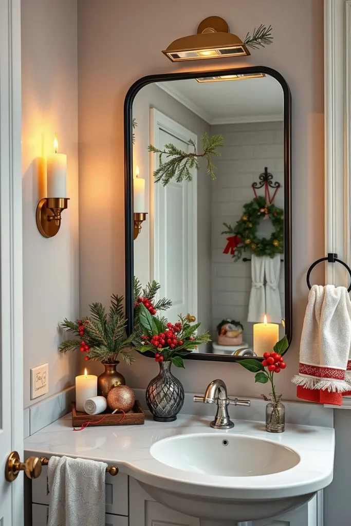 I prefer to mix natural resources with the tones of red, green, or gold that occur seasonally like wooden trays and ceramic containers. New towels knotted with ribbon and a little vase of holly or fir branches immediately transform the place into a Christmas and yet classy one.