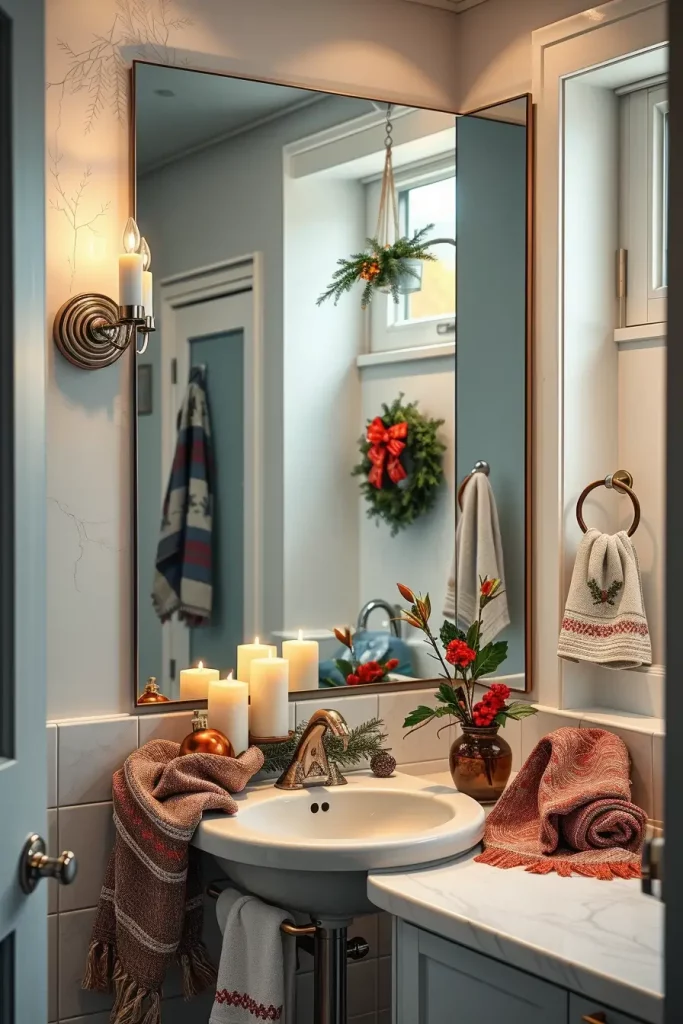 When people consider adding Christmas decor to the bathroom, this may seem strange, however, this appears to make the home feel more cohesive. In my opinion, small details, such as pine-scented candles, plants in the vase over the mirror, or a holiday bath mat, are a much more effective way to add cheer.