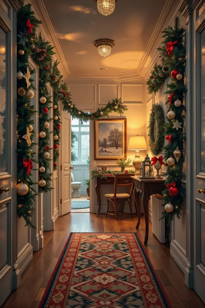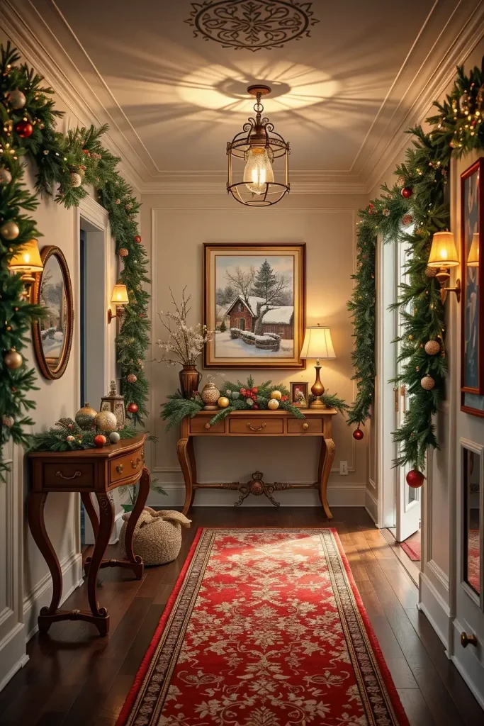 The decor of the Christmas hallway is the first ingredient to meet the guests, and I never fail to consider it as the beginning of the theme of the house around Christmas. I usually begin by a garland along the banister or console table with warm white lights and ornaments that are a part of the scheme of the living room.