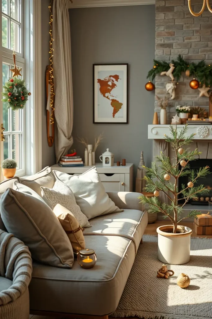 My decorations comprise of statement items such as oversized wreaths, decorative gold or silver candles, and metallic ornaments, when decorating. Plush cushions and pattern cushions are also used to complement the aesthetics of the room but at the same time they are practical. The combination of neutral color scheme and elements of dark green or burgundy gives elegance to the space without cluttering it.