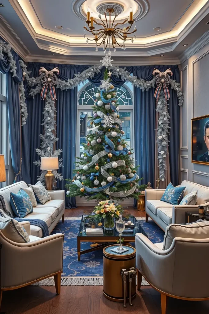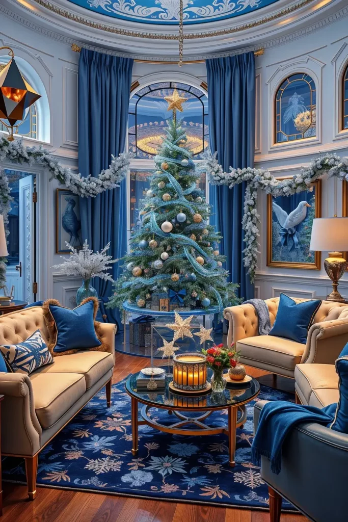 The furniture options are important in this case, as gray or white upholstering, glass coffee tables, and silver-framed mirrors perfectly fit the theme. In terms of lighting, the cool-white LEDs or silver lanterns that enhance the frosty effect should be used. A Christmas tree decorated with silver ribbons makes one immediately notice a blue tree.