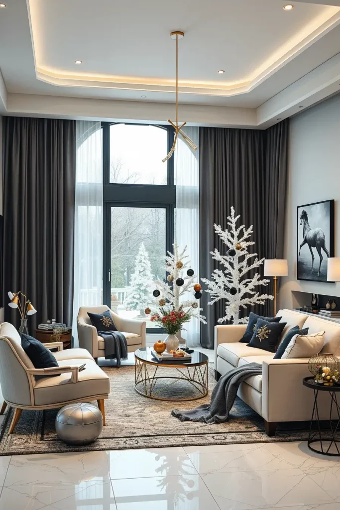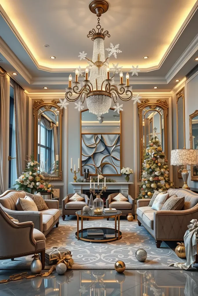 In designing the room I will focus on the layers of light. A big chandelier with shiny crystal snowflakes may be a standout piece, and the sconces on the wall, fairy lights, and intelligent candles should be used as a source of soft light. Glass decorations with velvet ribbons or pearl beads on mantels and shelves help to create the luxury atmosphere. The furnishings are to be in tandem with the glow consider plump chairs in unemotional colours and mat cushions to complete the elegant touch.