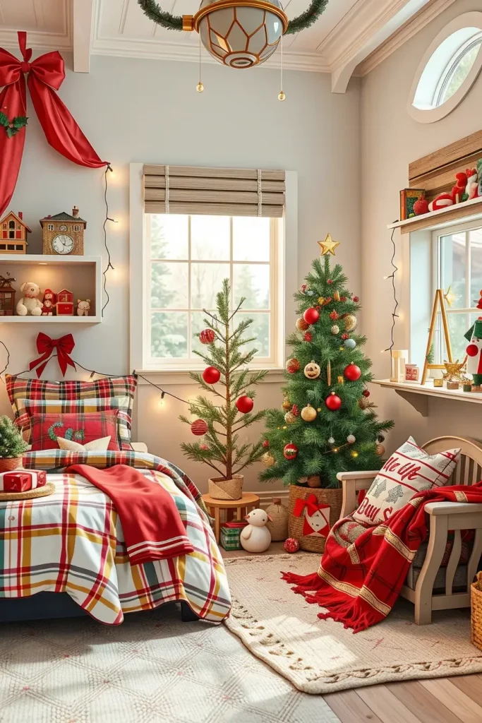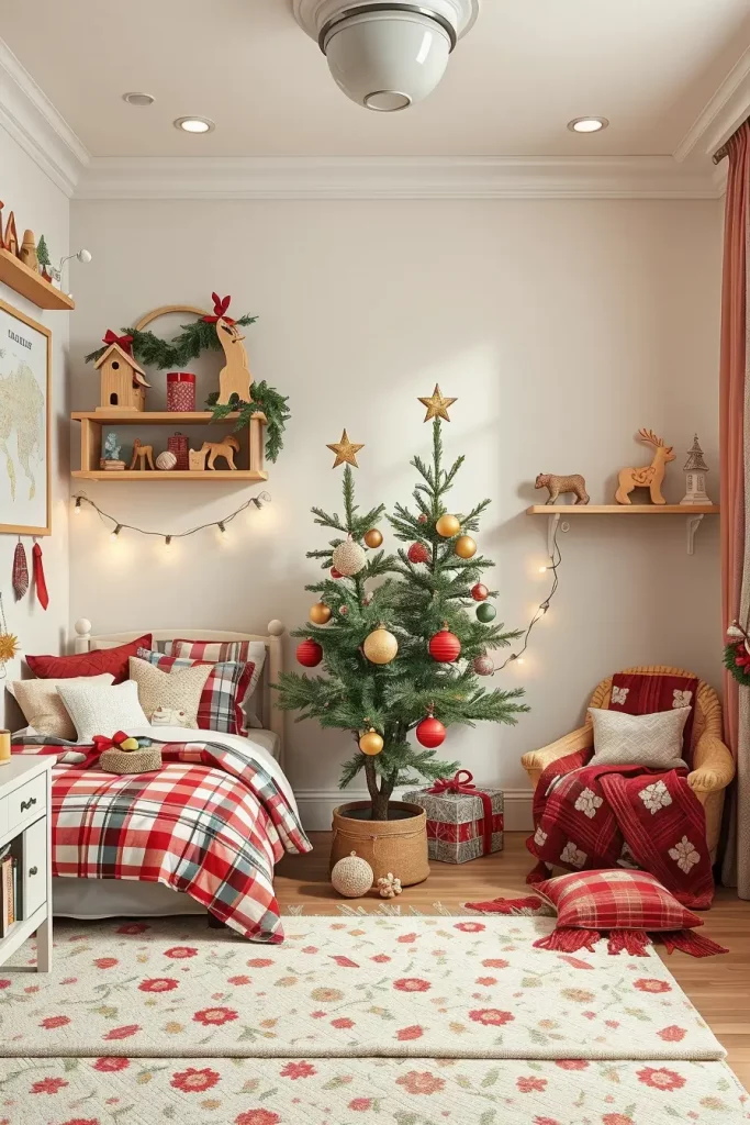 In terms of furniture and accessories, I will suggest the combination of functionality and party spirit. An artificial Christmas tree, no bigger than a foot, hung with shatterproof ornaments, is indispensable, and a plaid bed, or a red and white throw, brings the coziness right away. Wooden toys on shelves may also be used as a source of nostalgia in decoration. To make it look more comfortable, I prefer to add a child-size reading nook with plush pillows, fairy lights, and a blanket with holiday theme.
