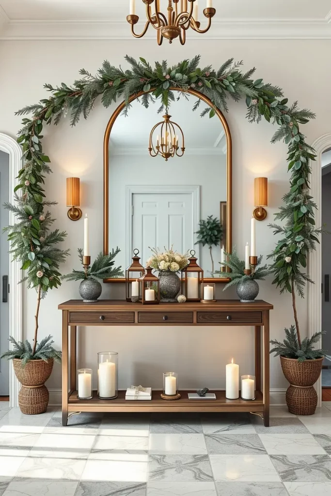 A slender console table with glass lanterns, metallic candelabra, and a statement mirror are several items that I incorporate in my designs. A green wreath and the packages with presents near the door make up the picture. These facts provide harmony between the interior and exterior themes of decoration.