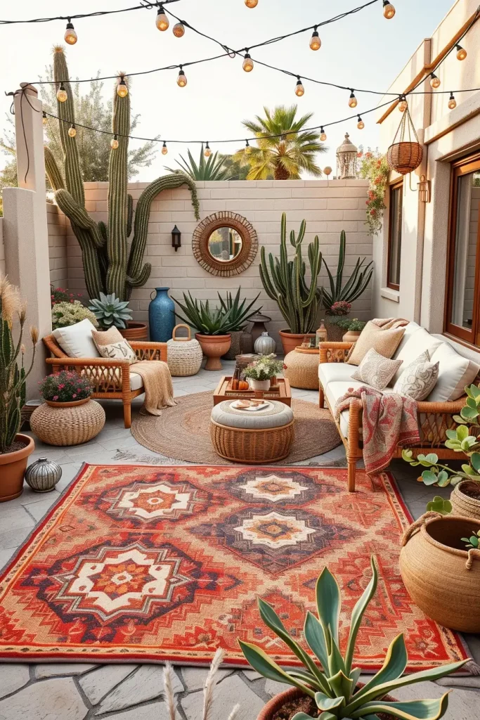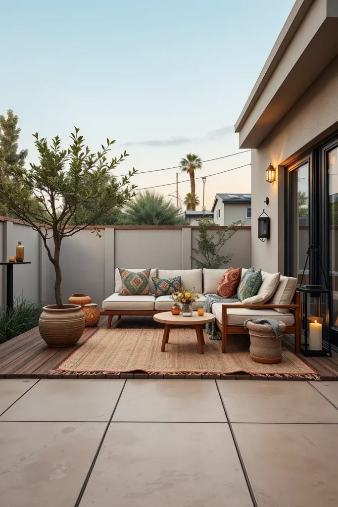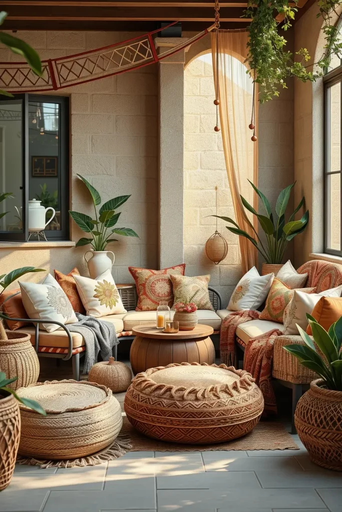 Another thing that makes one of the most attractive features of a boho-style patio the intelligent layering of textures. To create the foundation, I use a woven rug with easy-to-mix colors or earth tones, and I sprinkle handcrafted cushions and throws of several fibers, such as cotton, jute, and wool. These sets of layers make the space warm and deep but not heavy and filled with clutter.