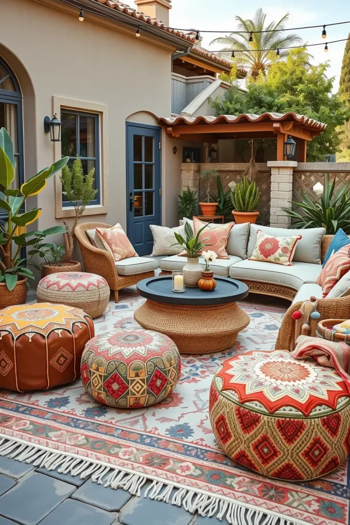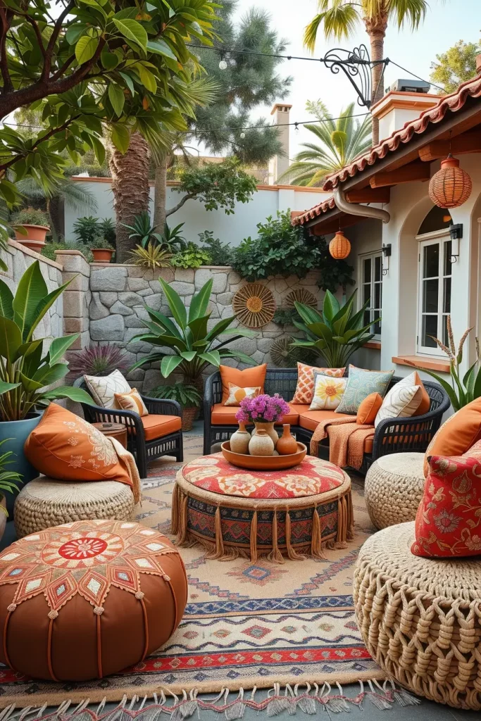 I prefer Moroccan leather poufs, embroidered linen cube and jute knit ottomans. I like earthy tones such as camel, soft coral, and stormy blue, with globe-inspired patterns to refer to the wanderlust that is the thread of the boho-style patios. I group them in clusters with a central table or loosely put under pergolas in case they are to be considered impromptu.