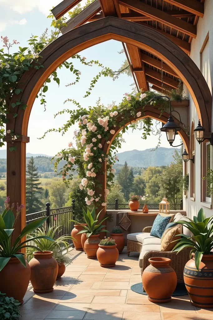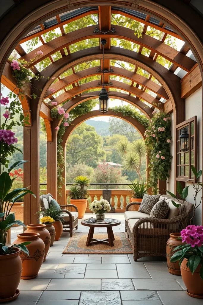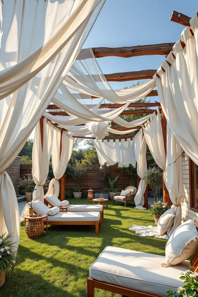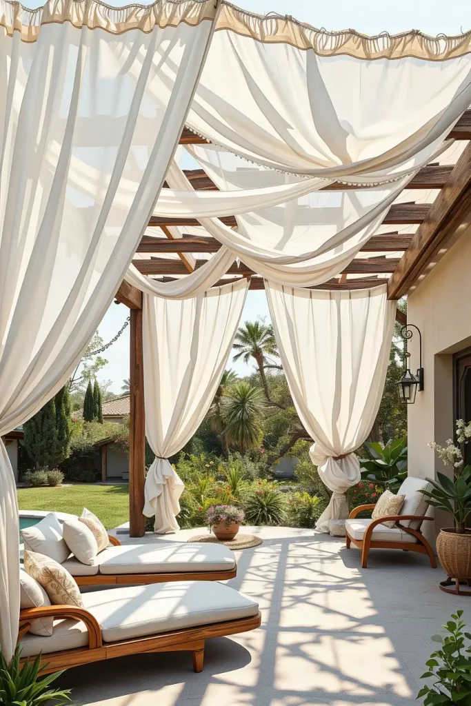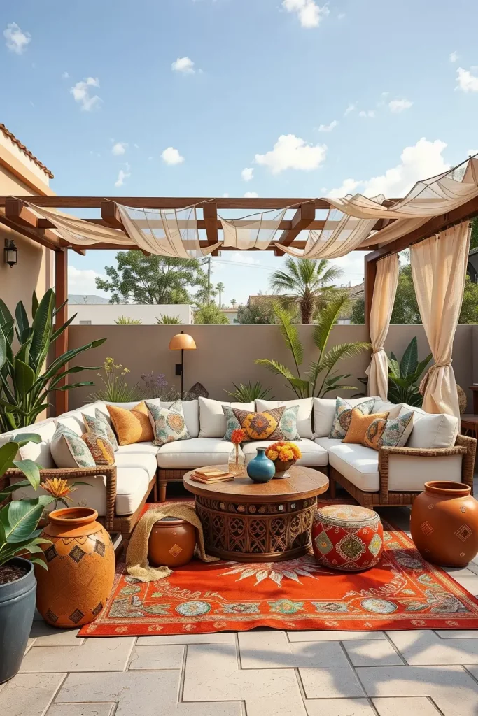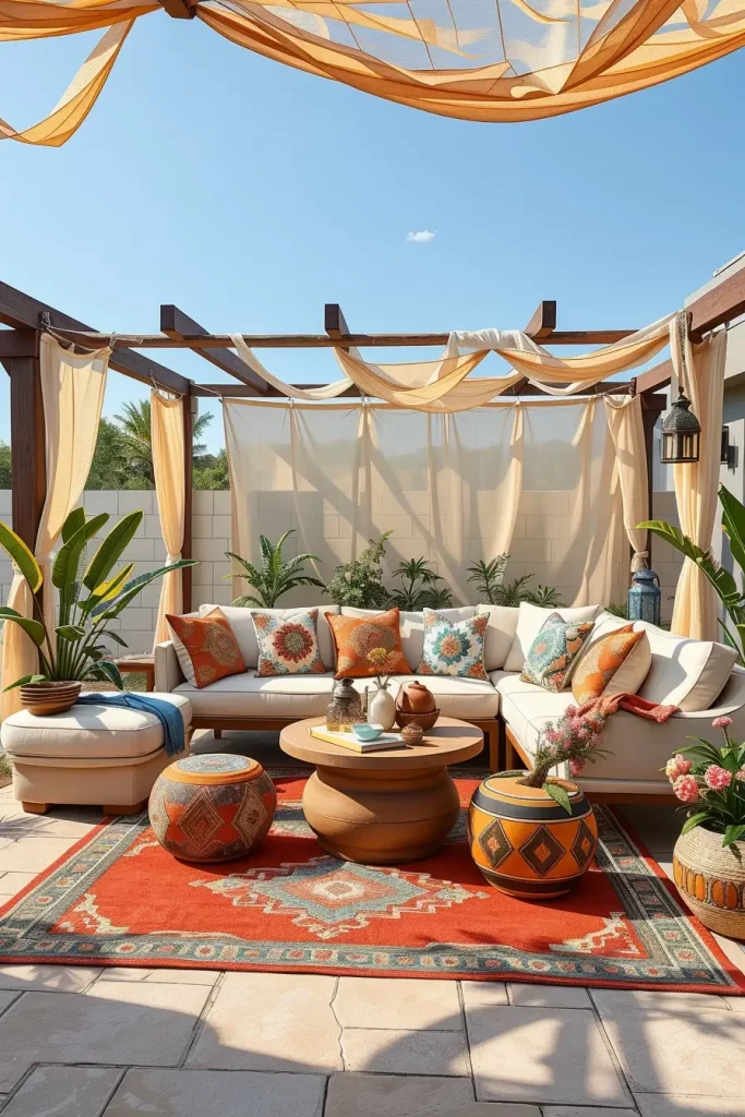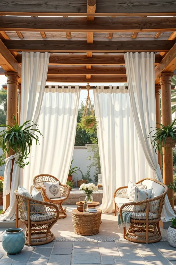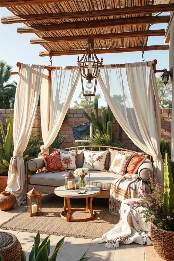 Pergolas are also used in most of the boho style patios, and I love to decorate them with soft, flowing curtains to create some softness. The said architectural features are not only space-defining, but also leaving a chance of vertical styling opportunities through fabric, lighting and use of hanging plants.
