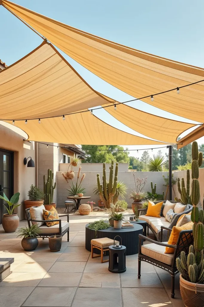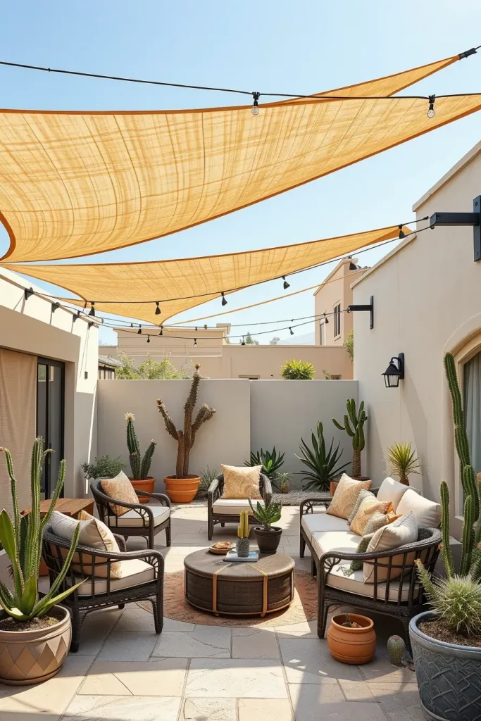 Whether on a modern boho-style patio, tailored shade sails are the sun protection style when it comes to desiring a patio shelter. I select triangular or shaped fabric sails in deserted tones of the warm beige, dust rose, or olive to comprise the floating, geometric canopy. These give much needed shade without ruining the outdoor effect.