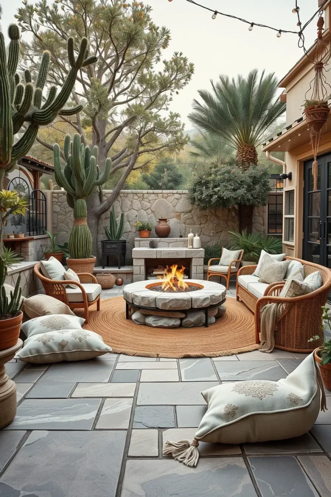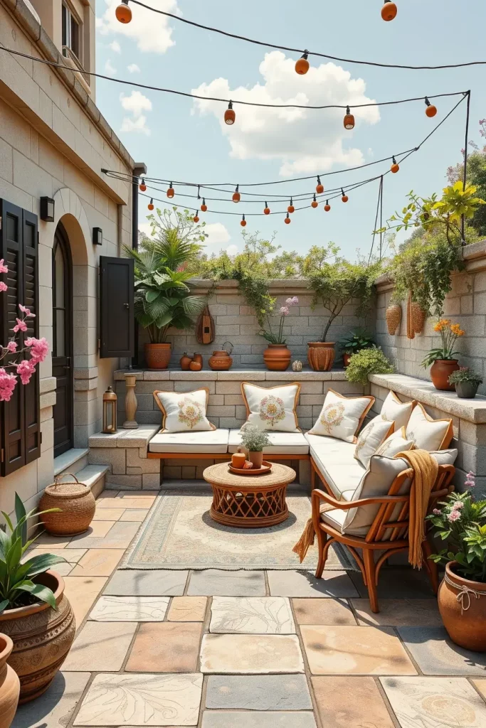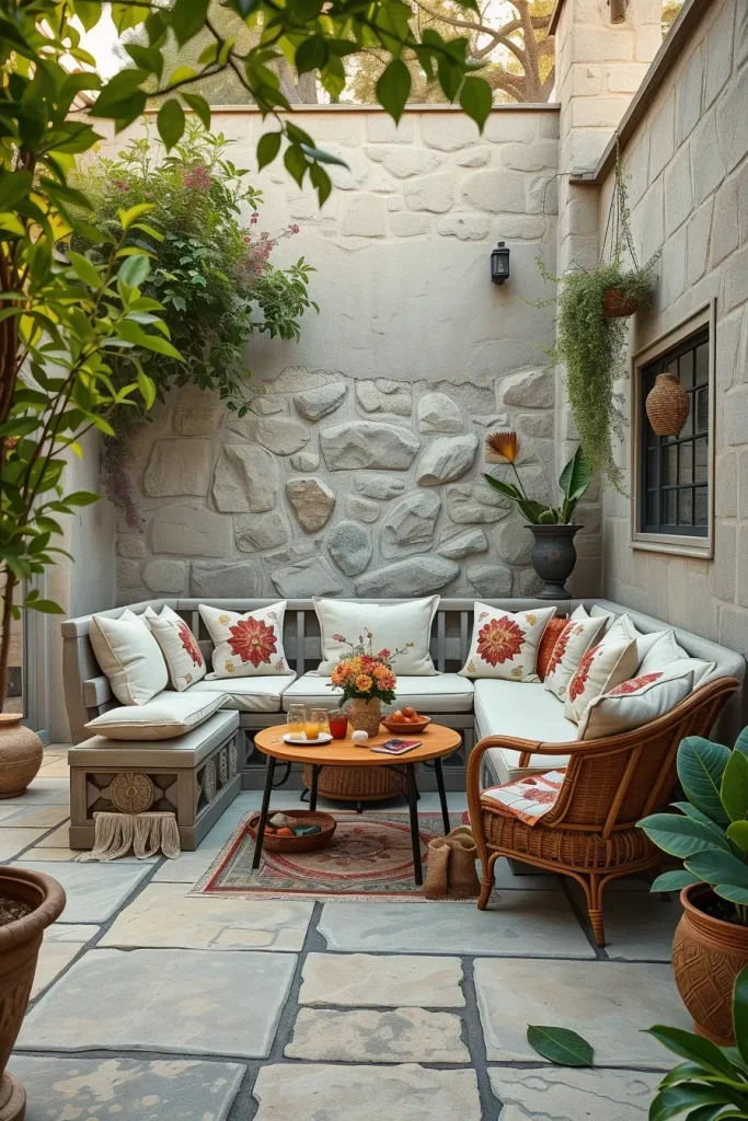 Boho-style patio is naturalized by stone elements which make it as timeless. When I want to bring in that touch of rooted serenity, I am fond of using natural stone flooring, low walls or even table bases. My best selection would be textured limestone, travertine and weathered granite due to their natural beauty and strength.
