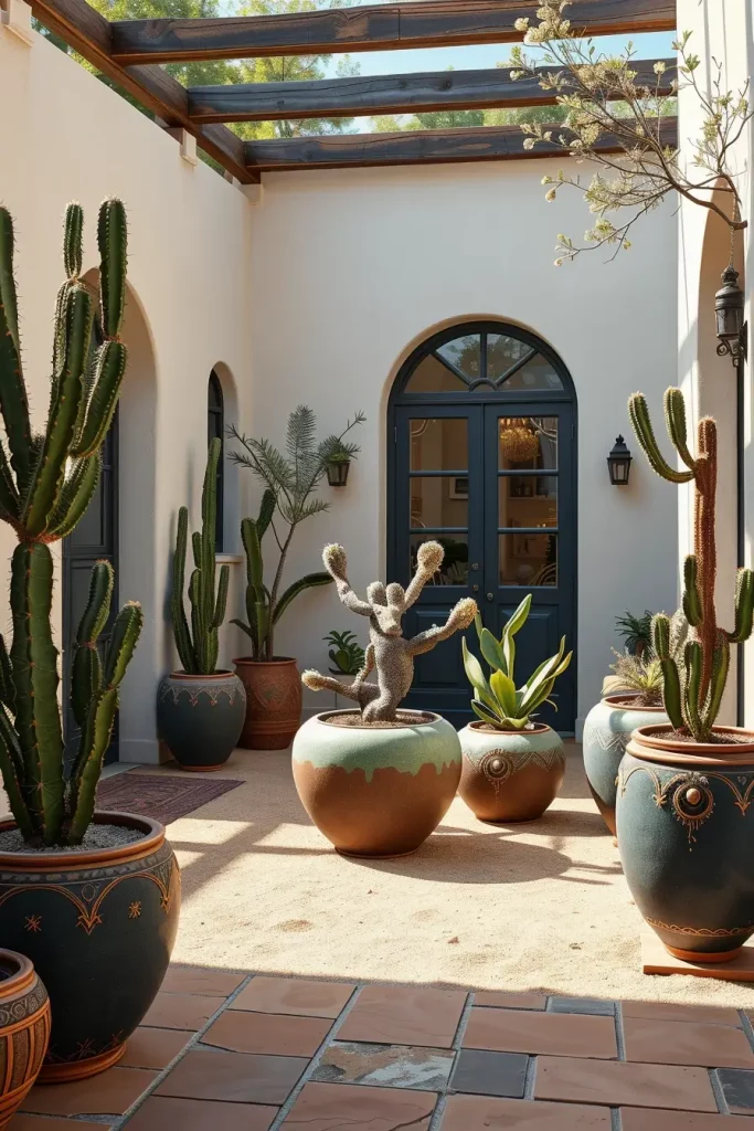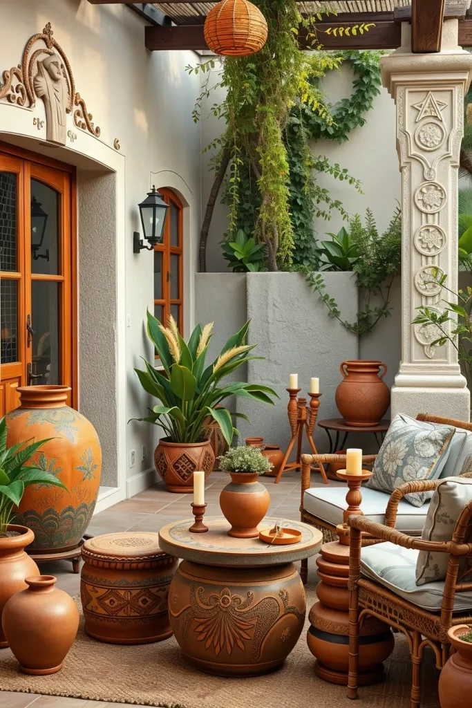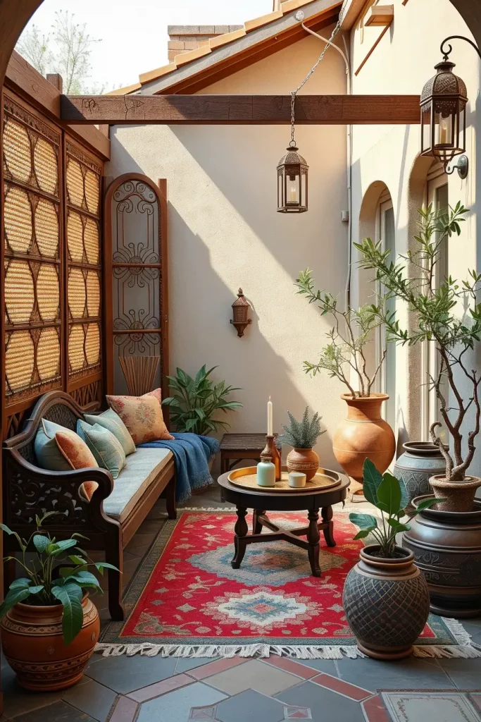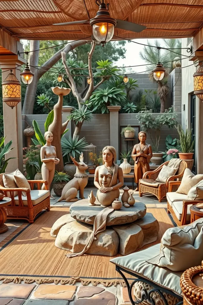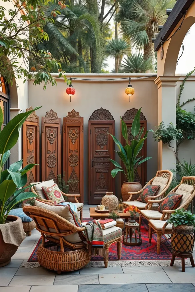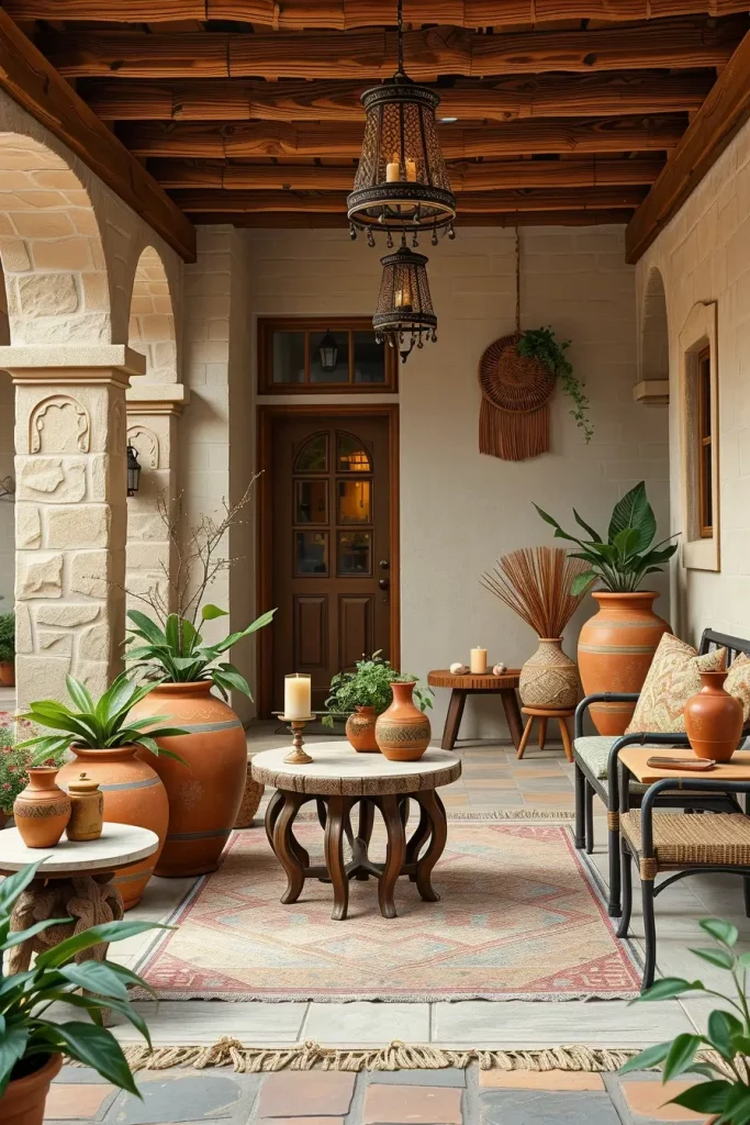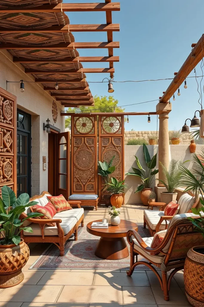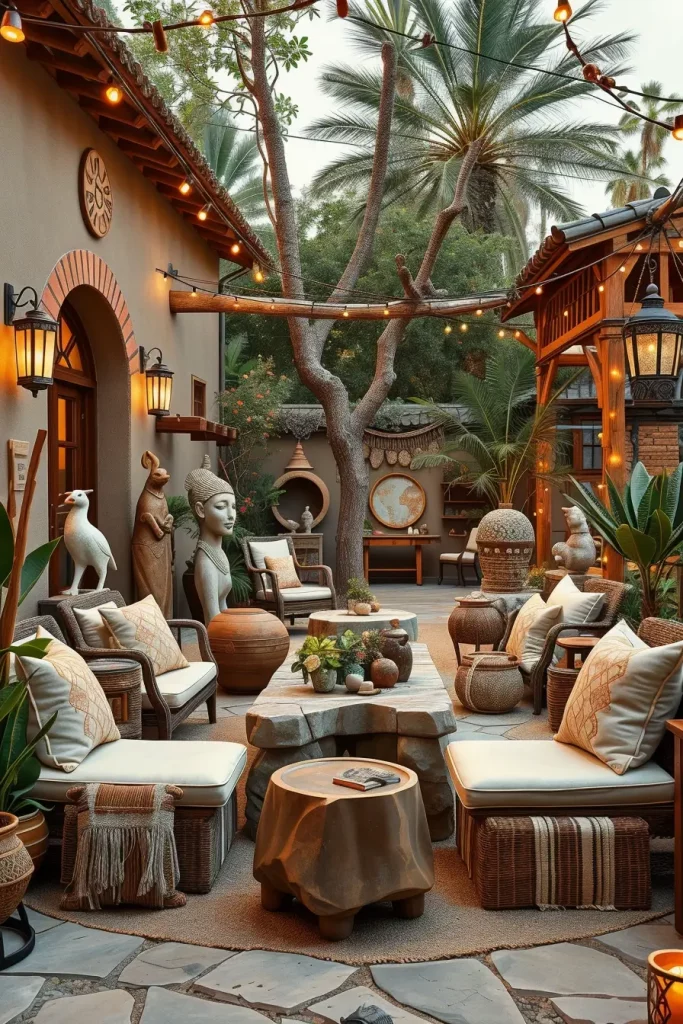 Wouldn arrange a small water feature or a mosaic tiling or a tribal type of sculpture to enhance the cultural story. Such elements would base the patio in touch with the surface and with maintaining the global design theme in a beautiful way.