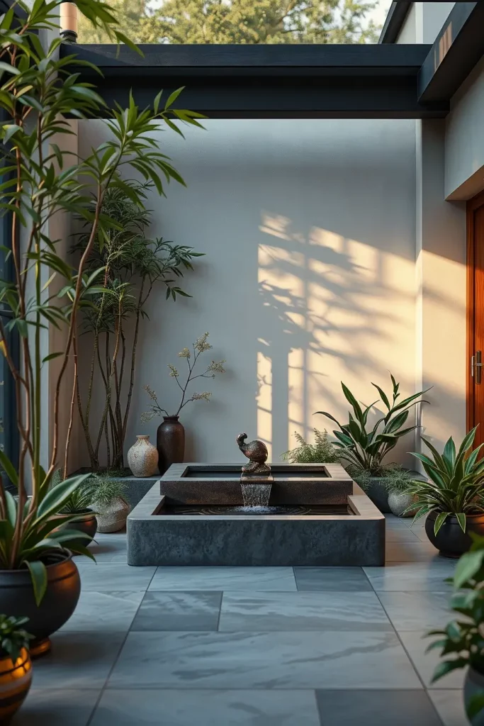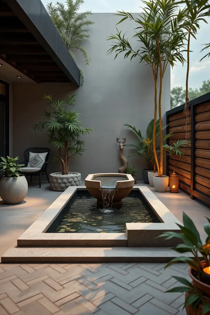 I have discovered that square or rounded concrete fountains that have minimal spouts go very well together with organic materials. To make it all hang together, use muted stone finishes, say gray, taupe or sand. My personal favorite is to be able to plant them around other, neighboring potted ferns or bamboo in order to elevate that zen aura.