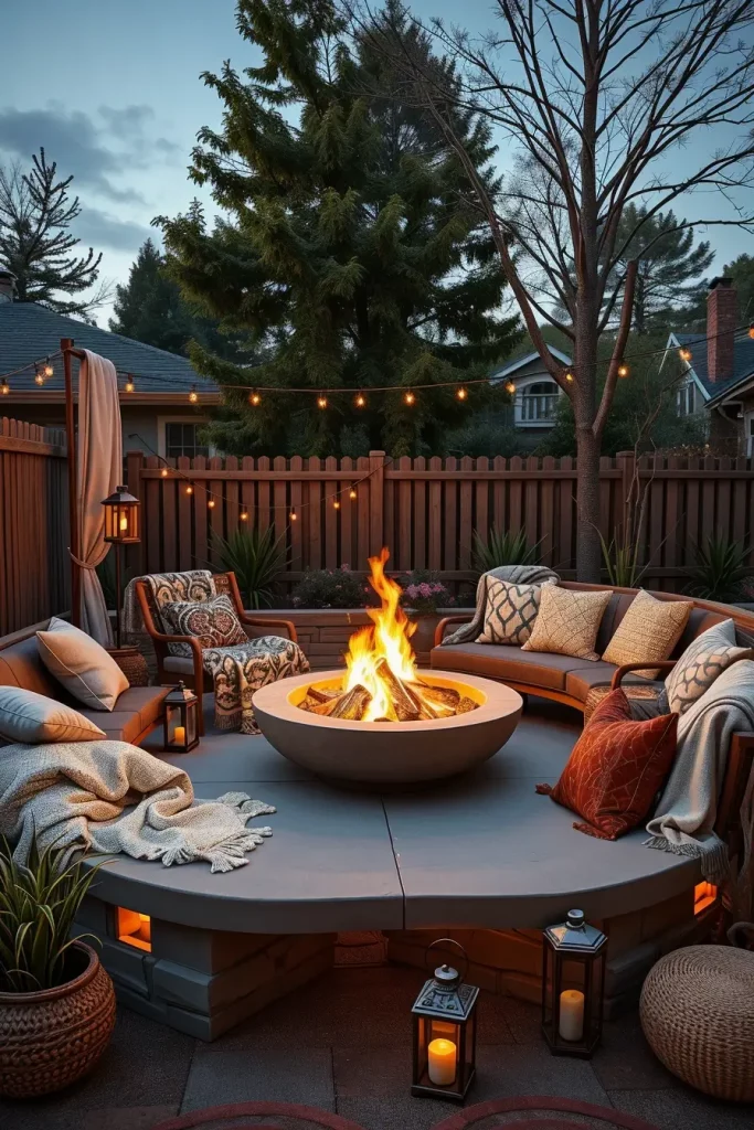 I am less comfortable with fire pits which have smoother concrete or rusted metal bowls and decking slightly raised. This forms a centre of interest and makes the place stand out. I place modular seating around the pit, cushions with plush upholstery and anything with texture as lot of throws to cushion the appearance.