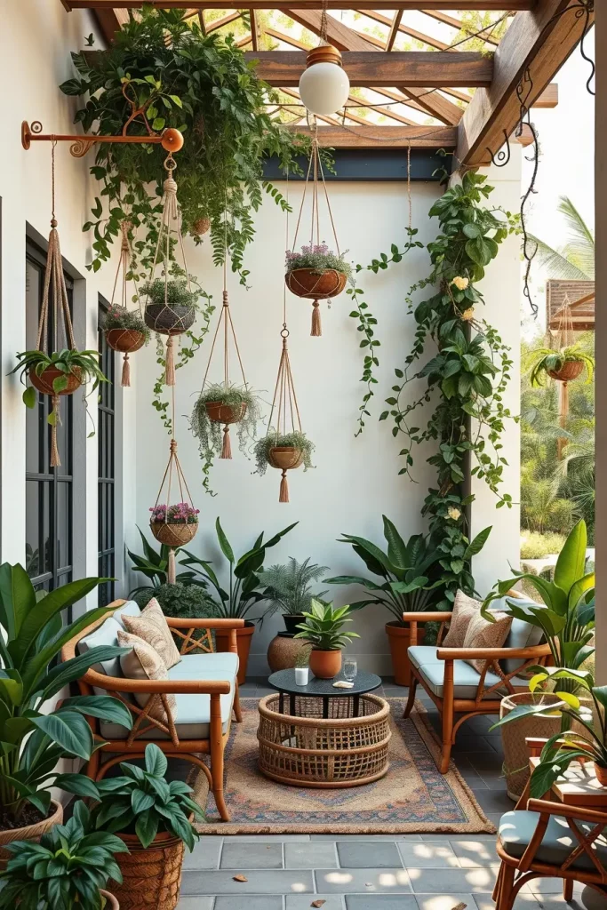 I once had a very narrow terrace that I created with the vine climbing on the edges of a pergola with macro planters hanging in the air above the lounge occurrence. It totally changed the mood into the tropical oasis. According to Veranda magazine, green walls inject depth and drama in compact places, and the concept is what I use on small structures whenever I want to give it a boho look.