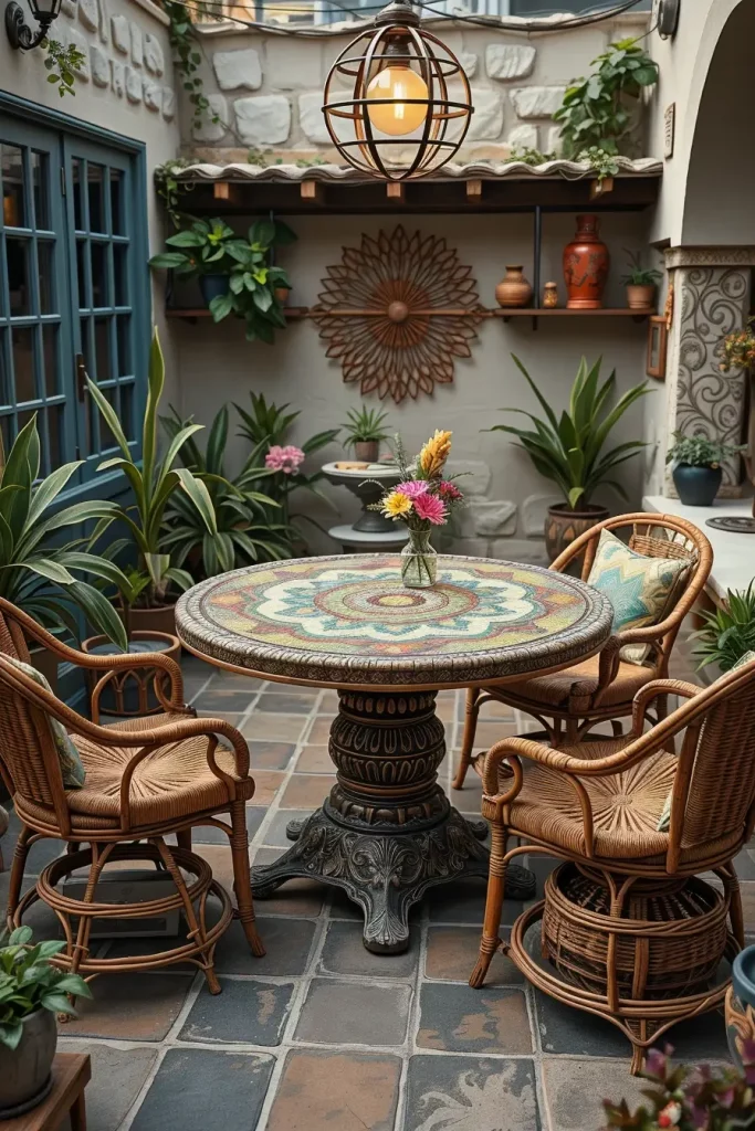A handmade mosaic table would be practical and artistic, which is also characteristic of boho pathways that appreciate being crafty and telling stories through sight. These tables add color, pattern and character to the smallest seating.