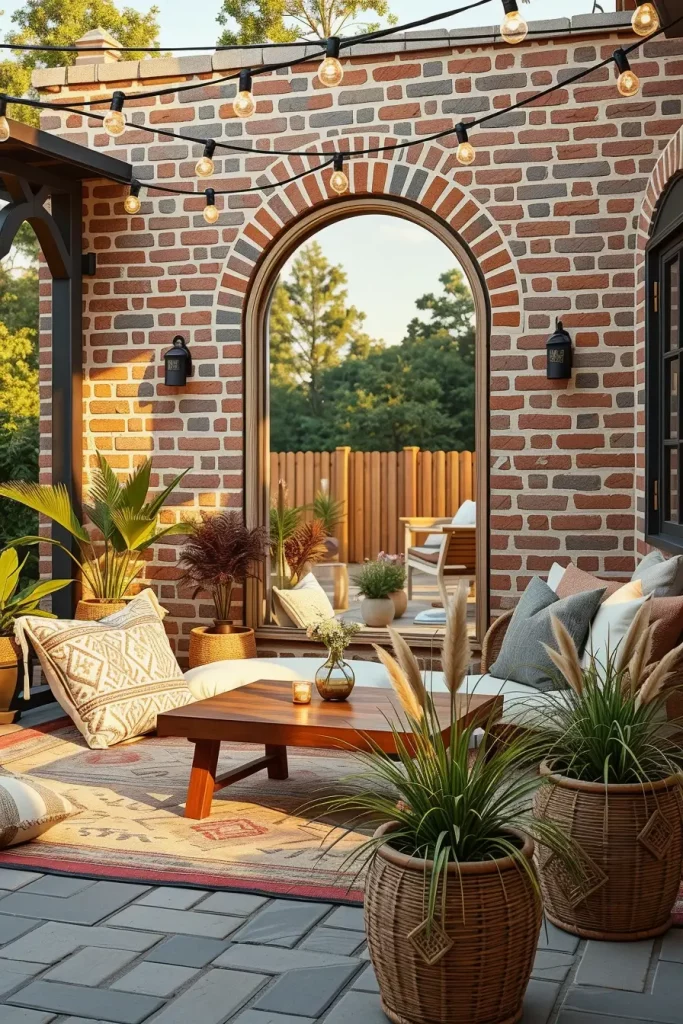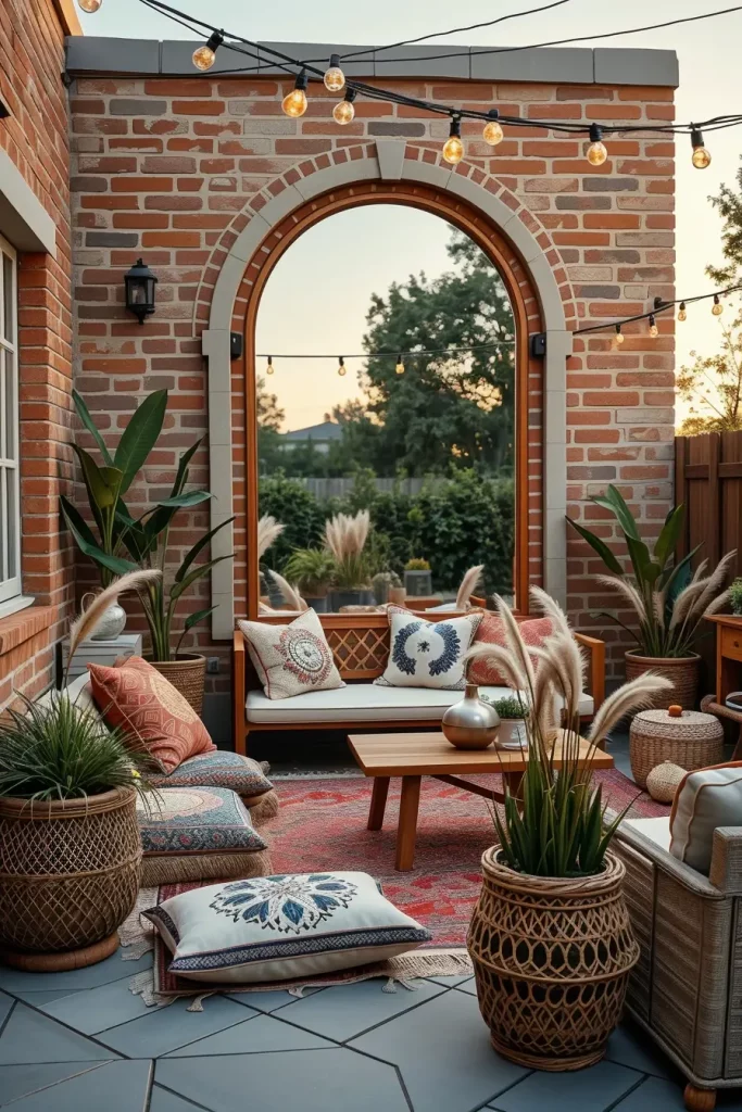 I have always been convinced that a mirror has the power to totally redesign a place even outdoors. Embarking on one of the most revolutionary boho patio concept, having a massive sized framed resplendent mirror installation is one of the best ideas. Not only does it bounce natural light and creates the impression of a more open and light patio, but also it introduces the elements of indoor refinement to the outside. A well-positioned mirror, such as a mirror against a brick wall or a mirror behind chaise lounges, brings depth and appealing drama which is artful and practical.