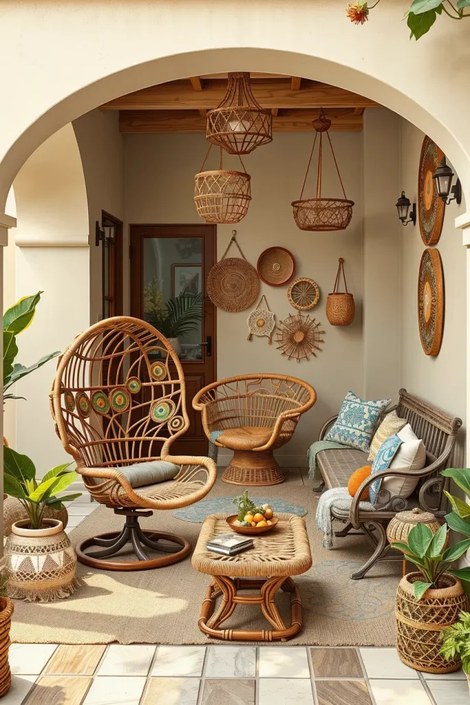 Modern boho-style patios usually feature woven accents, which provide an artistic depth and depth of detail in the weaving. My usual methods of introducing that visual poetry include using hanging baskets made of woven fabric, wall hangings done with hand-knotting, and furniture that has cane or rattan inlays. These accents serve as decor and as centers.