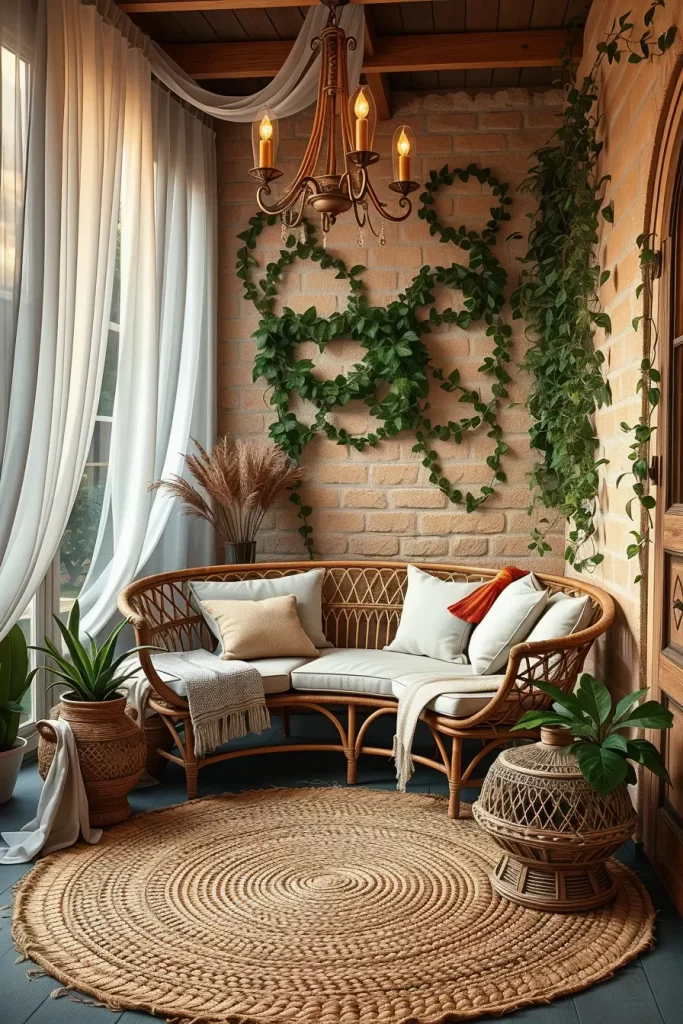 Within this intimate space, I added a lounge design of curved rattan loveseat, it is surrounded with extra-large linen cushions topped with a crocheted coverlet. An antique-style candle chandelier is placed above and there is a heavy jute rug on the floor to cushion the ground. The vines potted on the next wall add life and mobility to the seating.