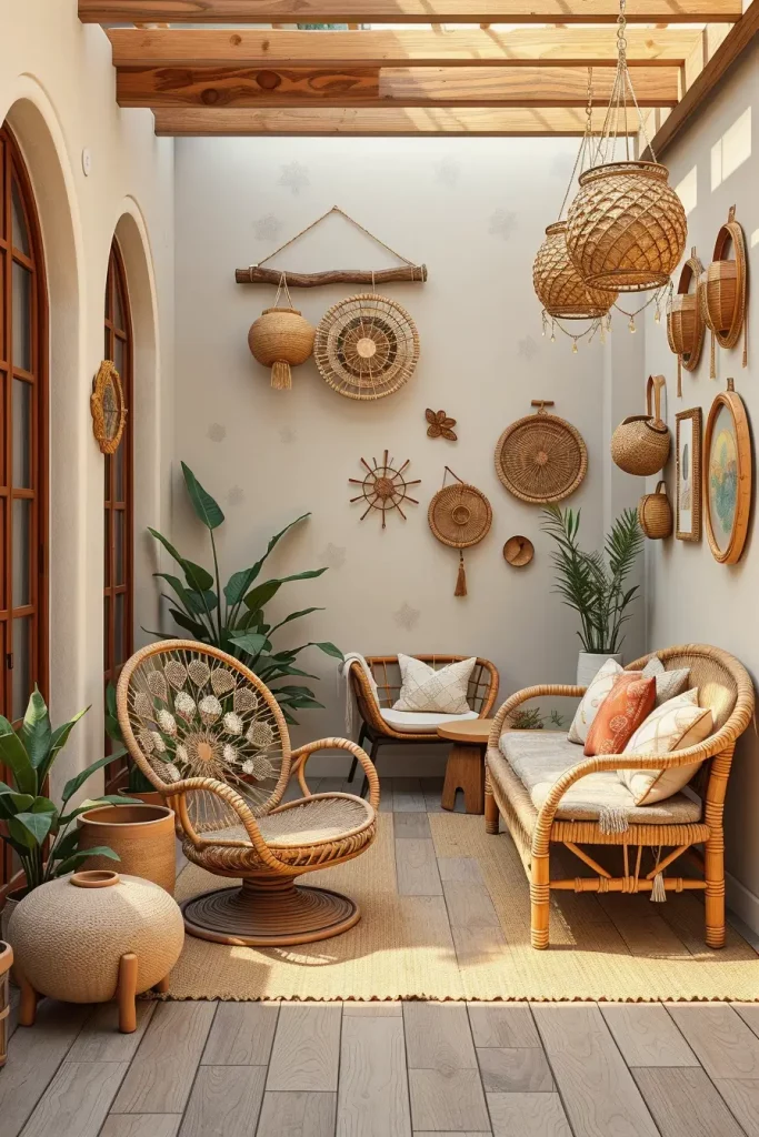 I would include here an art object, say, a wall-hanging made of textile materials with beads or tassels and add its slight dynamic and artistic touch. It would go in tune with existing textures and accentuate the designer style of boho designer decor.