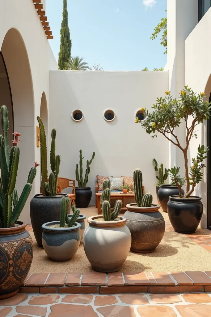 Mini art installations Ceramic planters can also redefine a boho-style patio. I prefer hand-glazed setting items that are oversized and have an irregular effect to them or be asymmetrical. This brings in a sculptural touch which balance the fluffiness of boho materials and furniture.