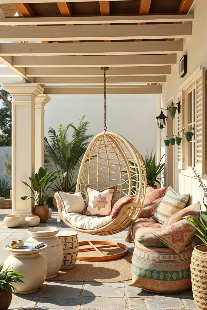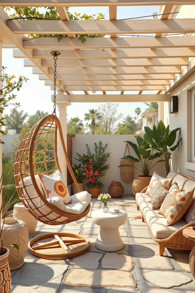 Introducing a hanging chair to any contemporary design of a boho-inspired patio will make it look instantly luxurious. These I frequently hang up on pergolas, or across above-beams, preferring, however, to them curved and soft profiles, which give a echo to the natural forms of boho design. The soft movement of the swing and the fact that they have a sculptural appearance enhance an atmosphere of relaxation and also a focal point of the setting.