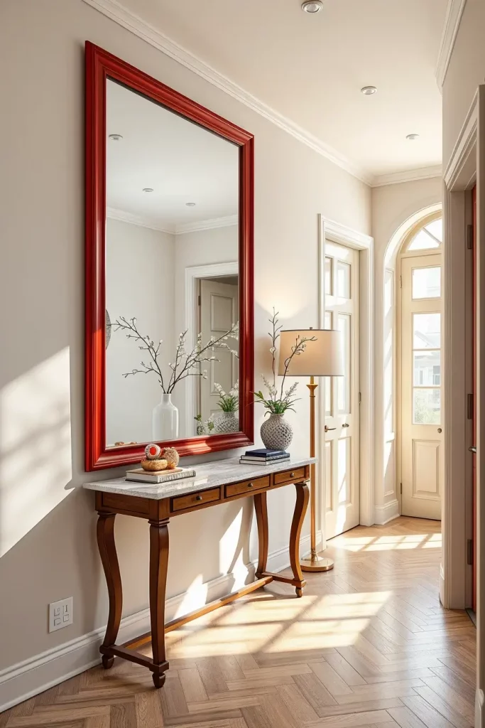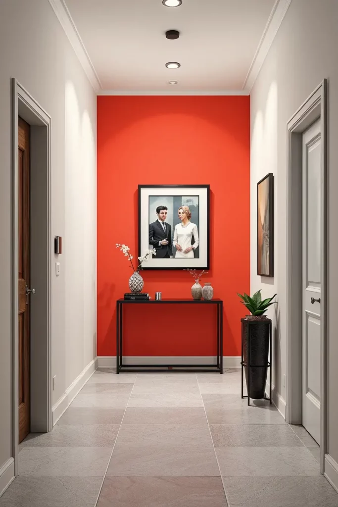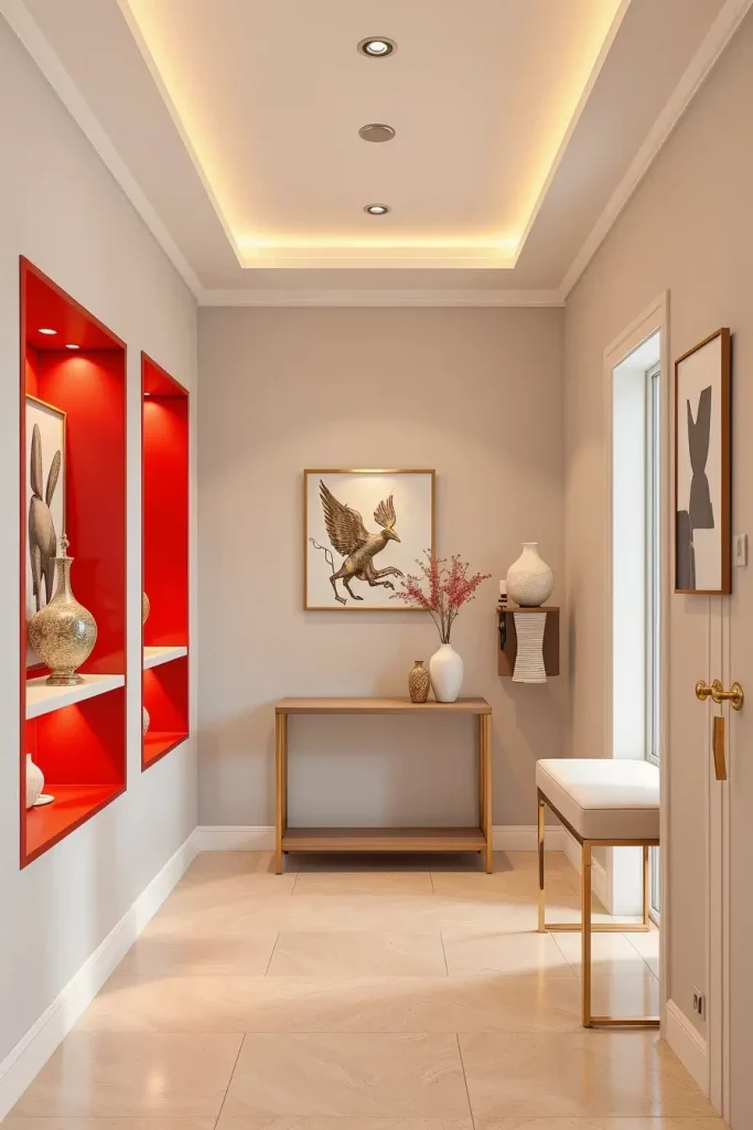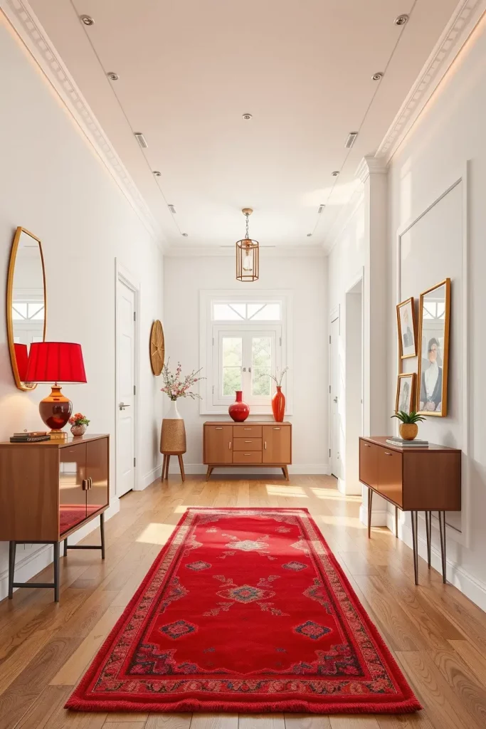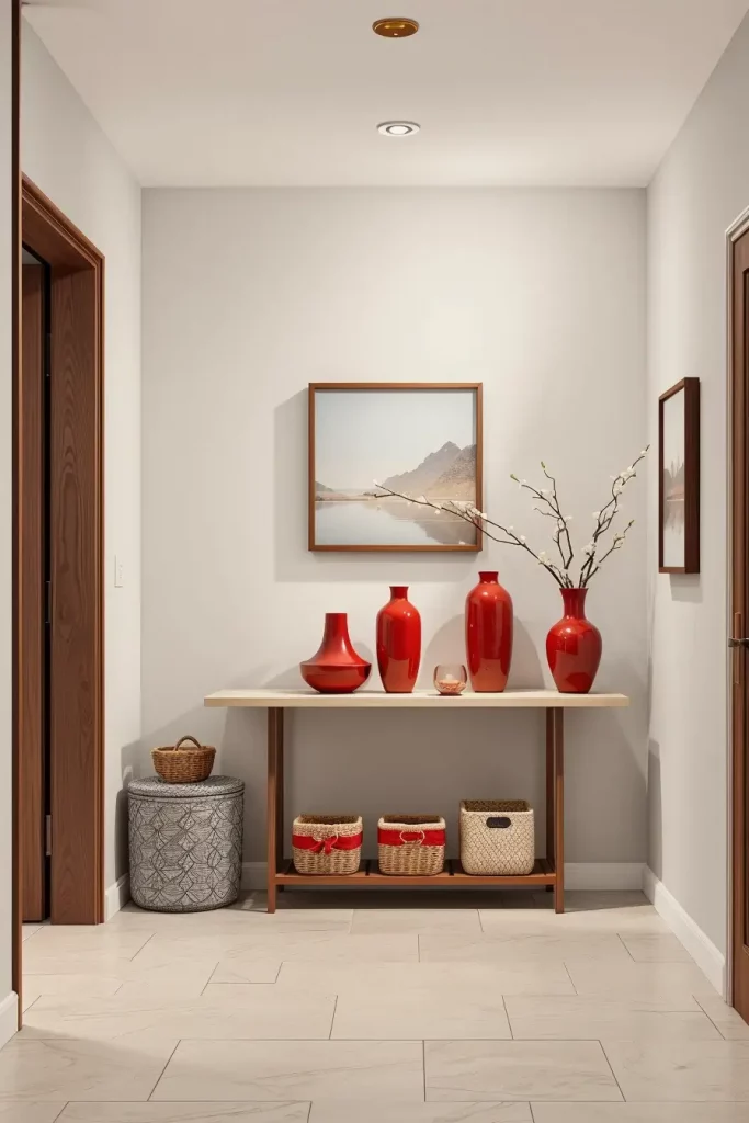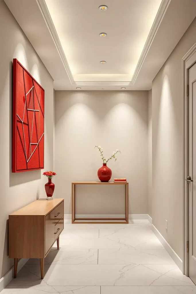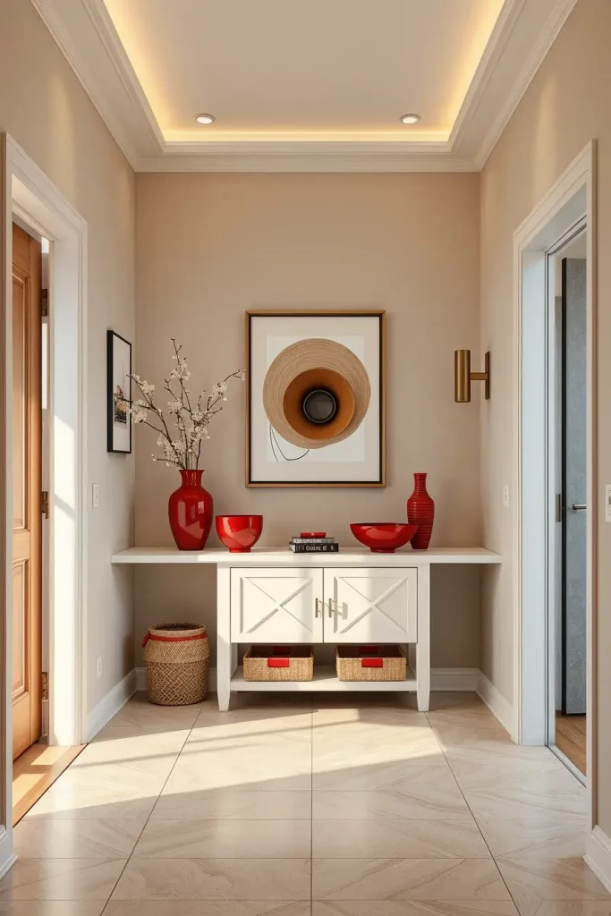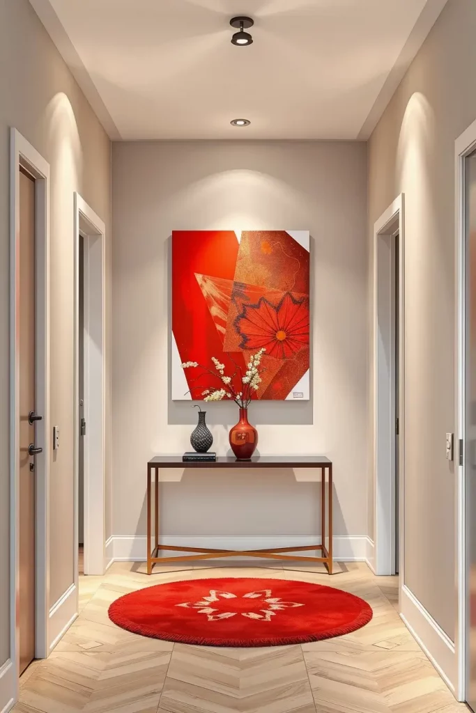 In some instances, all that is required in a hallway is the finishing touches. Small decorative items in red, such as vases, photo frames, or decorative bowls, can make a hallway look curated and intentional without overwhelming the overall style. I am a believer in the concept that less is more, and in transitional spaces.
