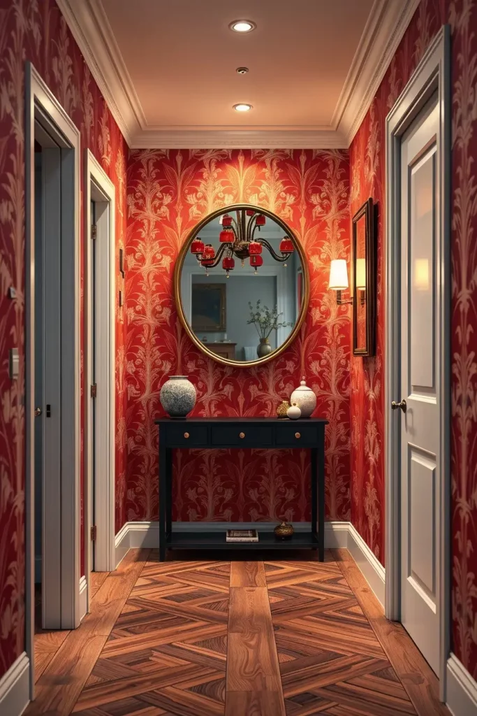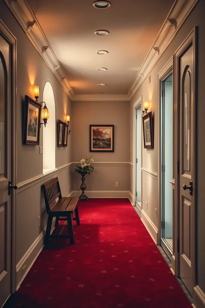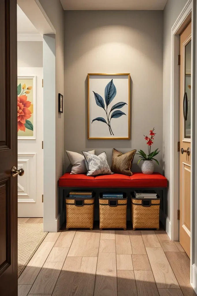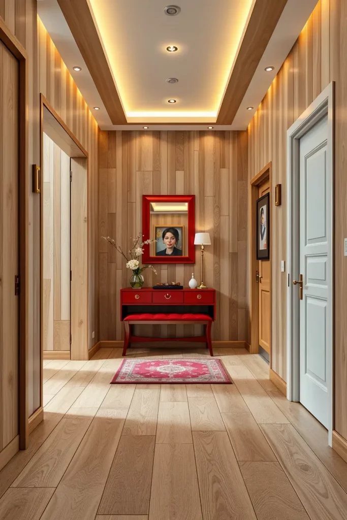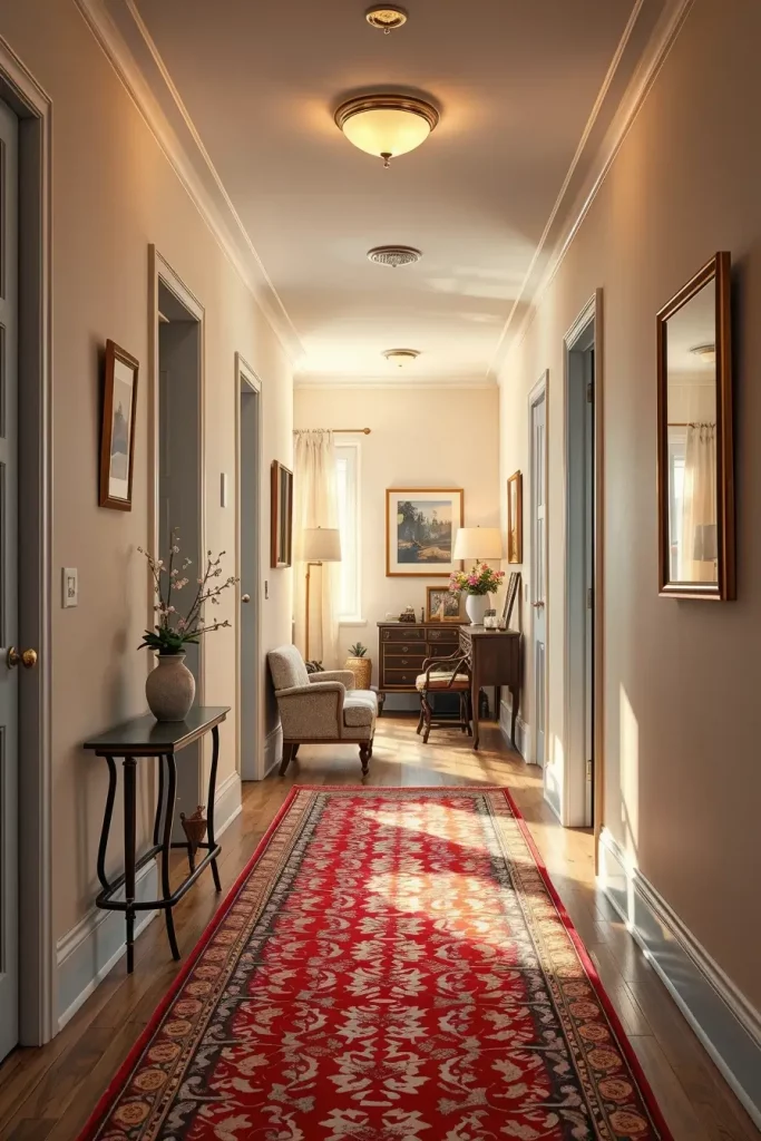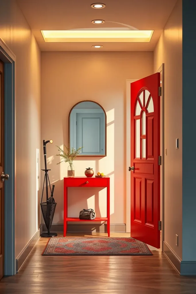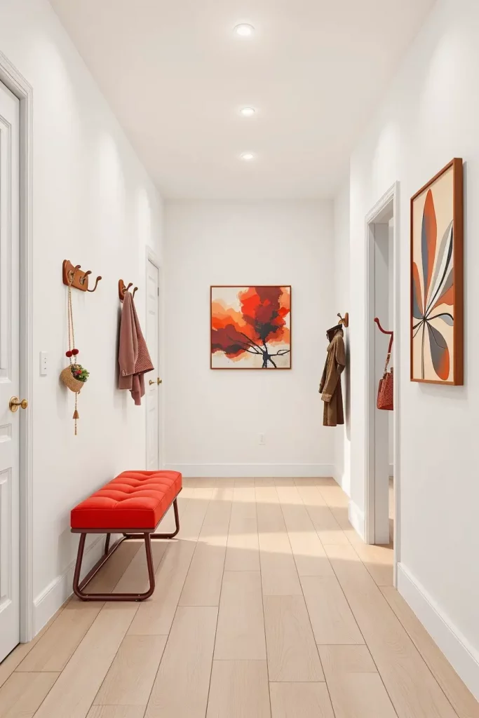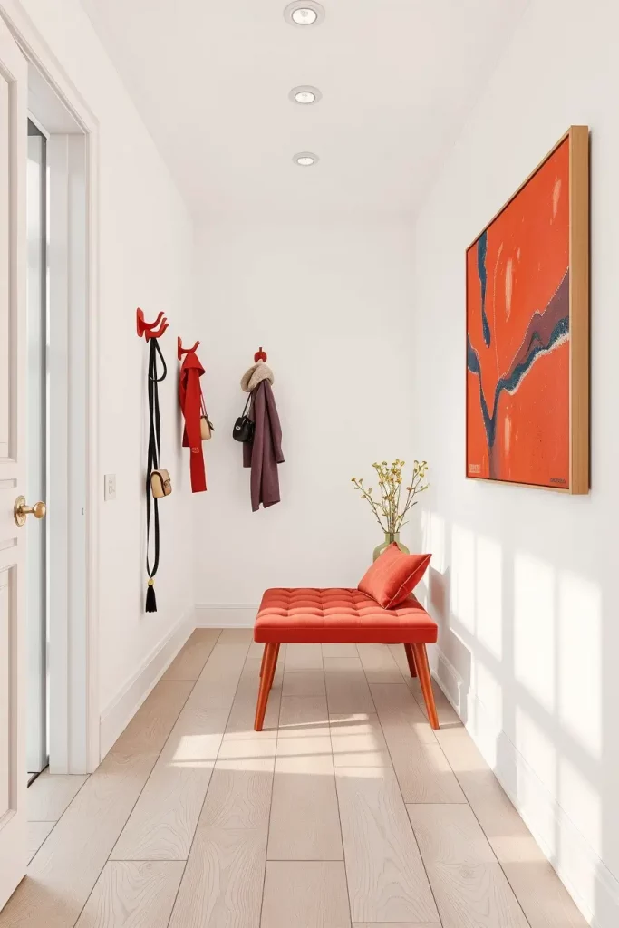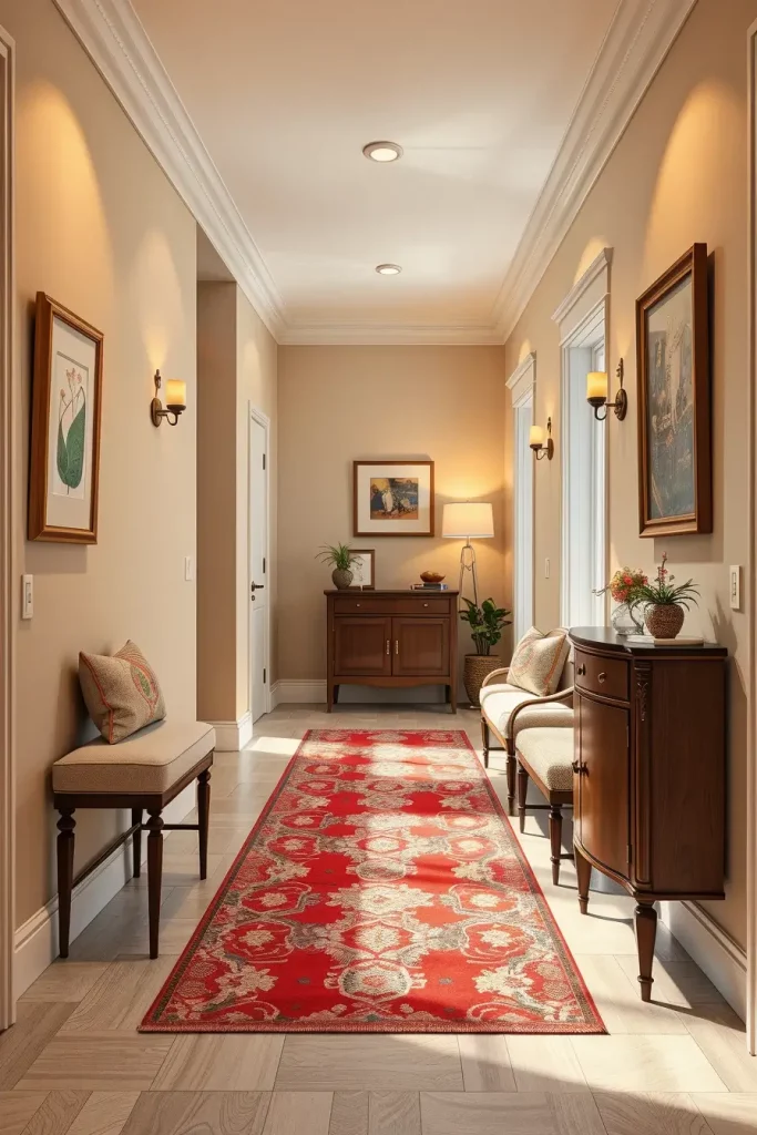 In some instances, all that is required in a hallway is the finishing touches. Small decorative items in red, such as vases, photo frames, or decorative bowls, can make a hallway look curated and intentional without overwhelming the overall style. I am a believer in the concept that less is more, and in transitional spaces.