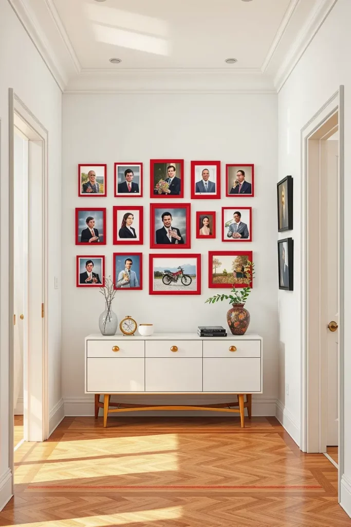 I like thin, contemporary frames that do not distract the attention of the viewer. As an example, a black-and-white picture in a red glossy frame attracts attention, but does not distract it. A red-framed gallery wall that is symmetrically placed also adds to the overall balance in the hallway.