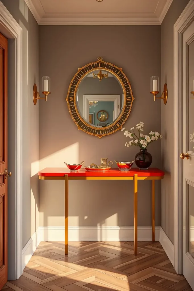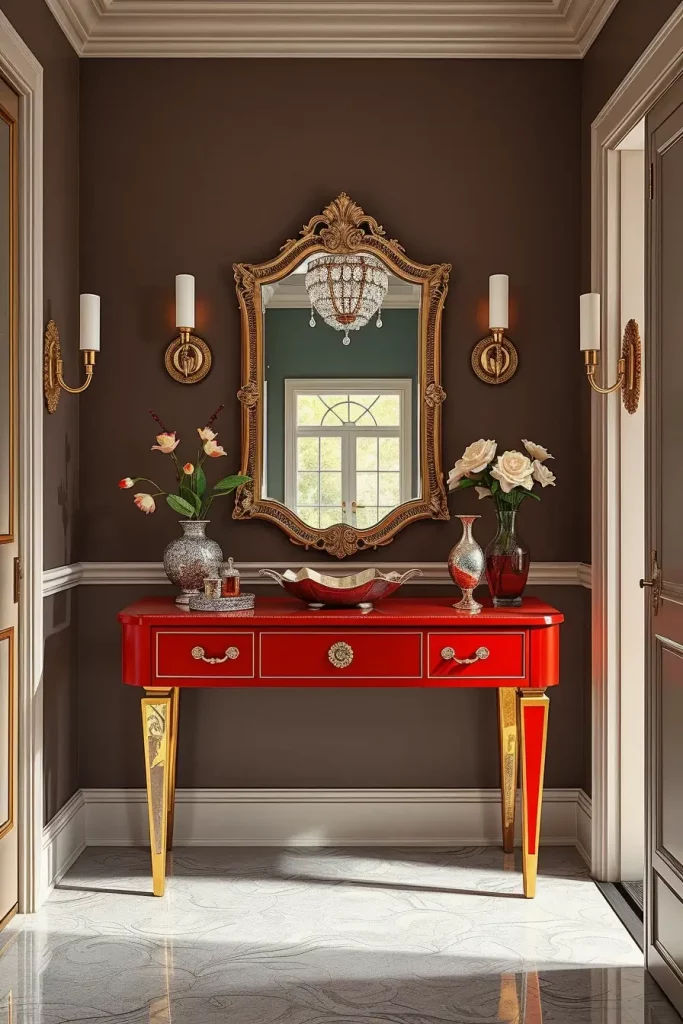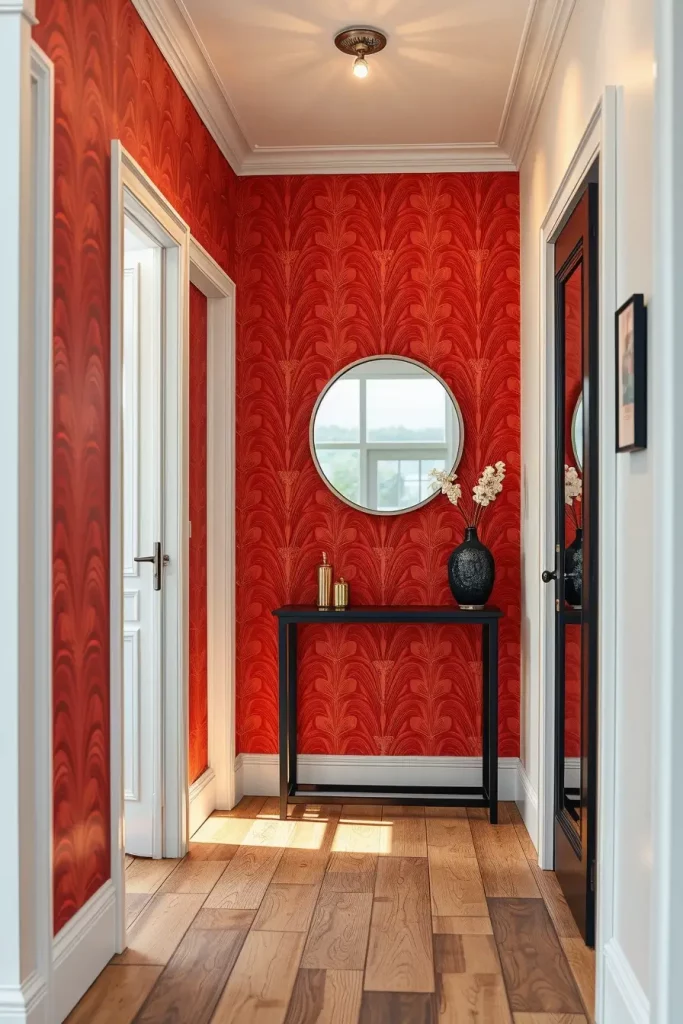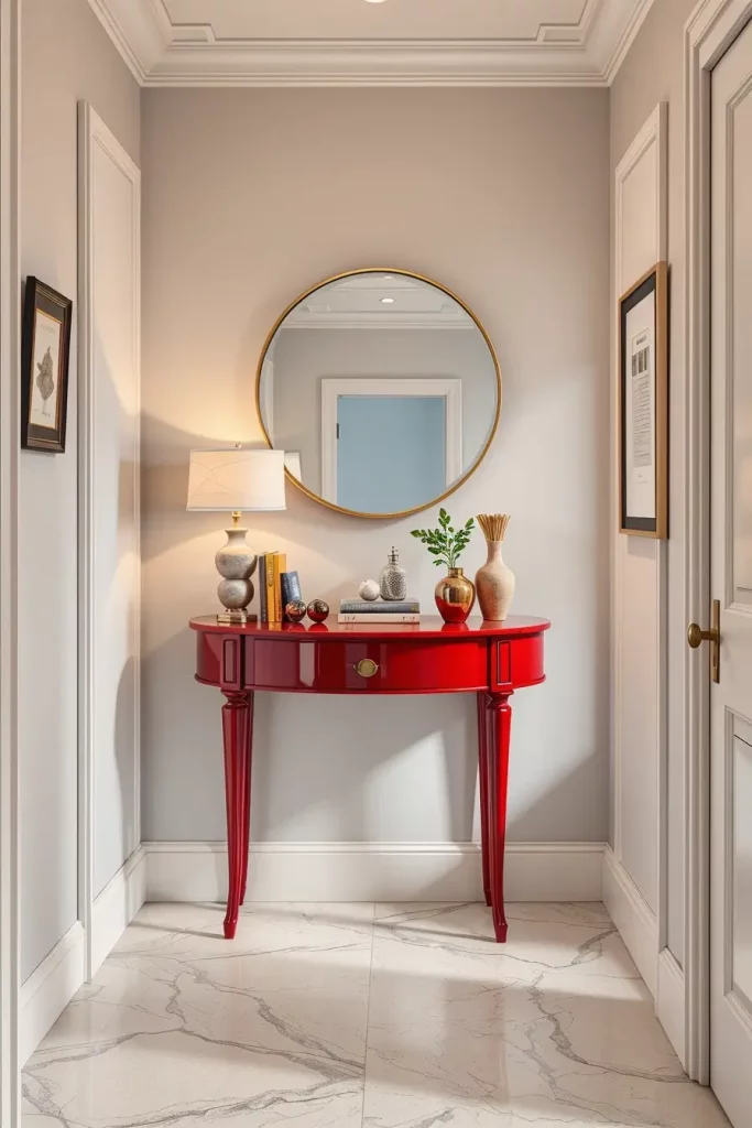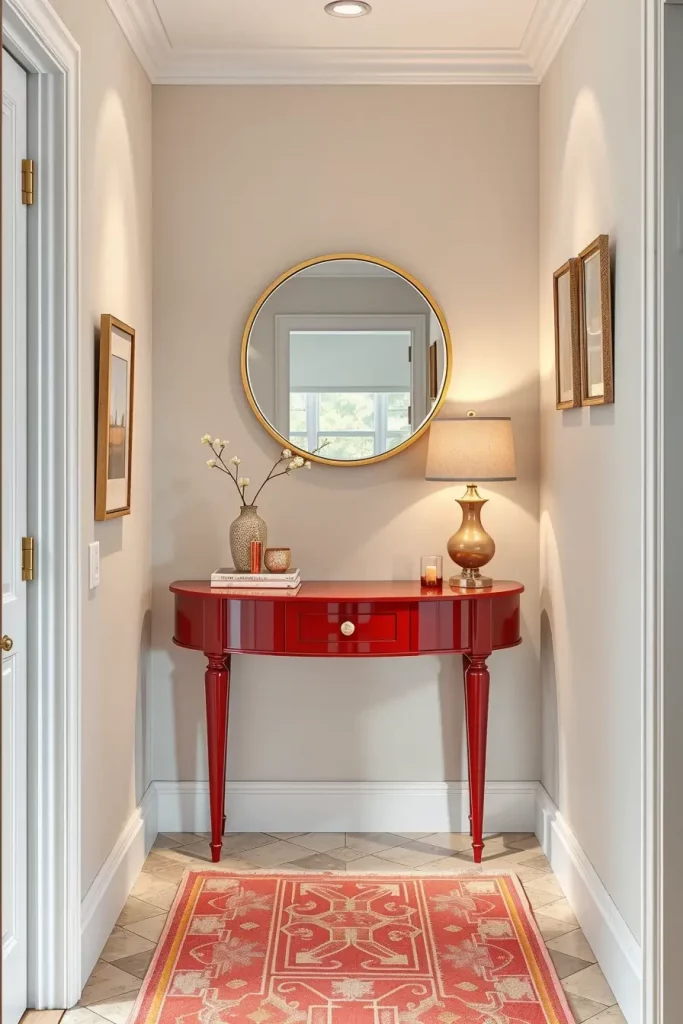 The table can be perfectly matched with accessories like a neutral lamp, a bowl of essentials, or even a stack of books with metallic accents. Hanging above it is a round or rectangular mirror that counters the aggressiveness of the red and makes the hallway appear bigger. I find this arrangement to be particularly helpful to those homes that do not have storage space, but desire elegance.