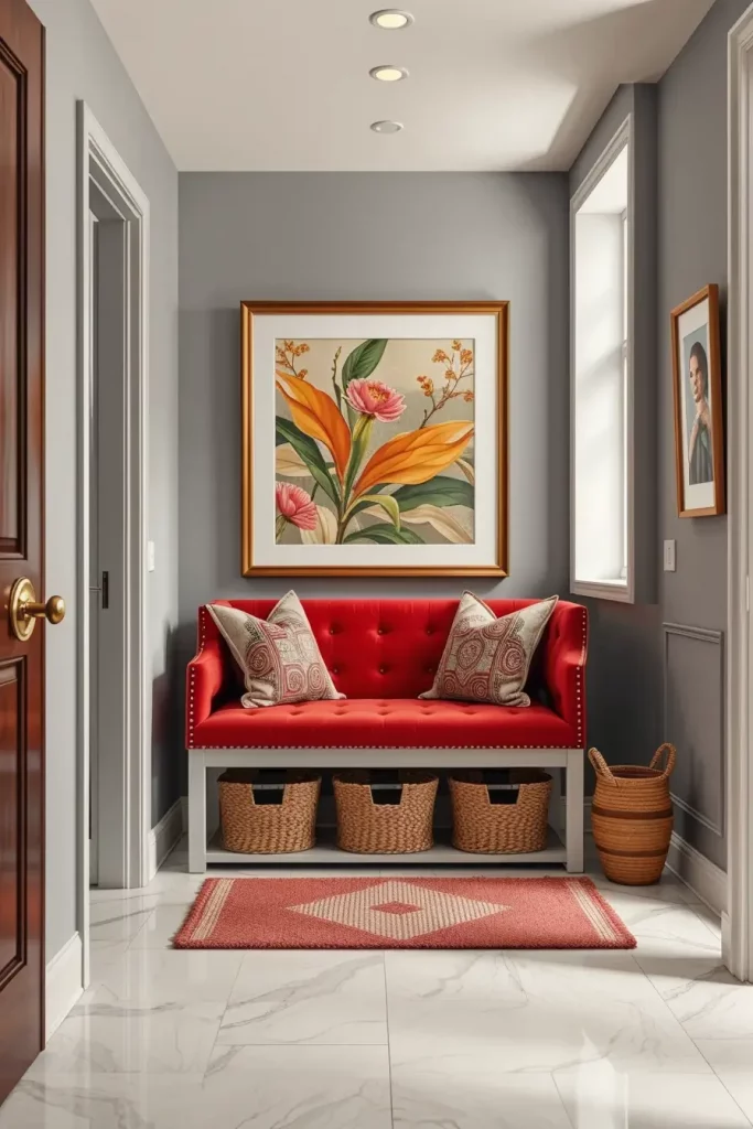 Seating in the hall might not be the priority one, but in my designs, I have seen how a bench with a red upholstery can be both practical and decorative. It provides a place to put on shoes or place bags and also provides some color to energize the entry.