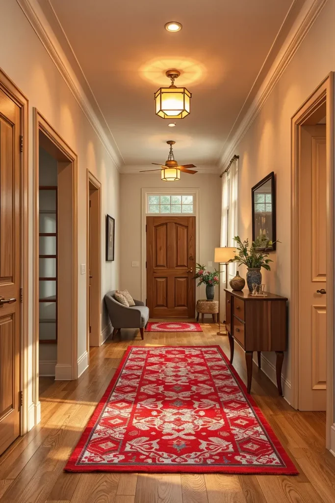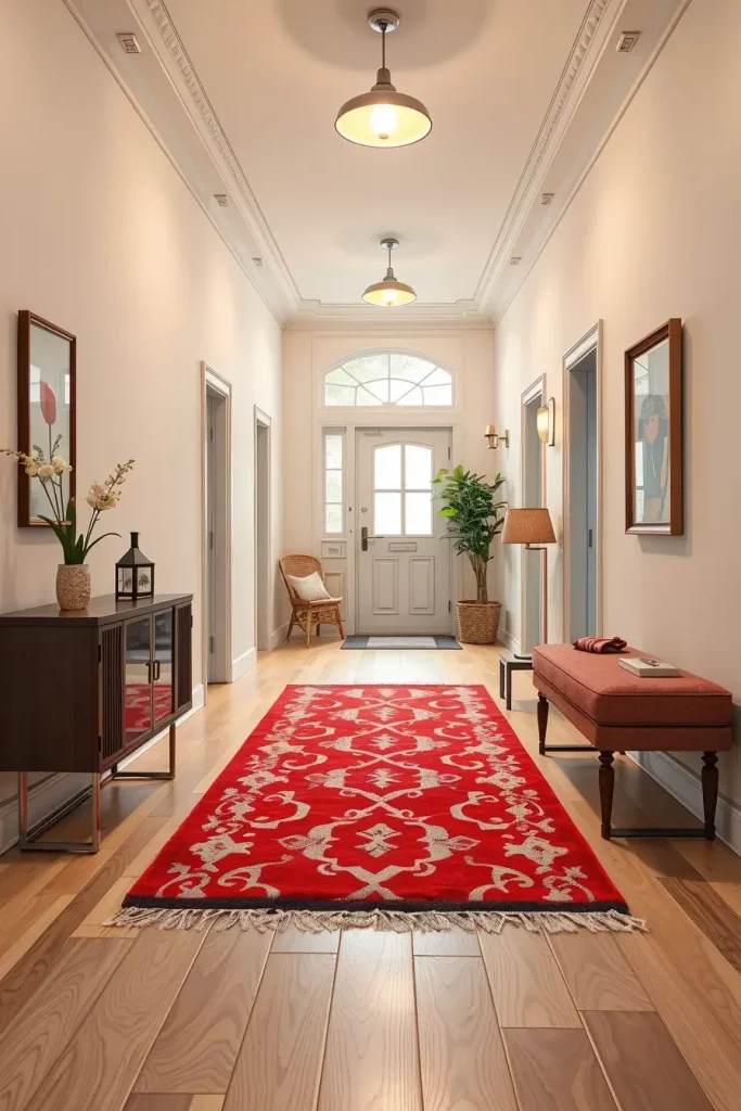 A floor in the hallway is usually not paid much attention to, but in my projects, I have seen how a red runner can change the mood completely. A patterned runner with deep red tones adds energy and direction to the space, guiding guests through the space in a natural way. It is a low cost method of adding boldness to homes with plain flooring without making permanent changes.