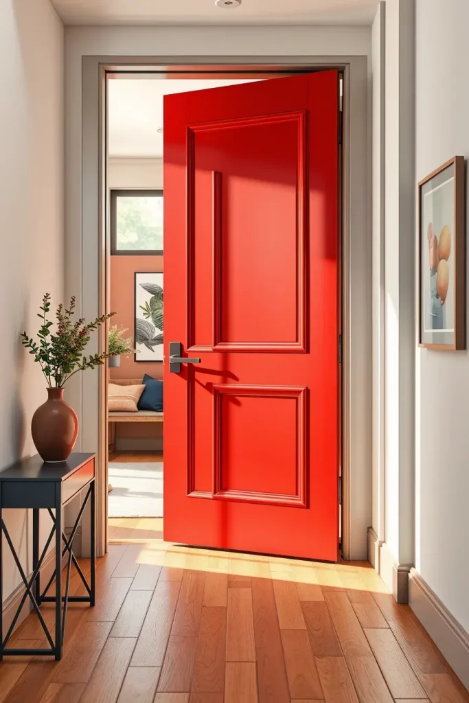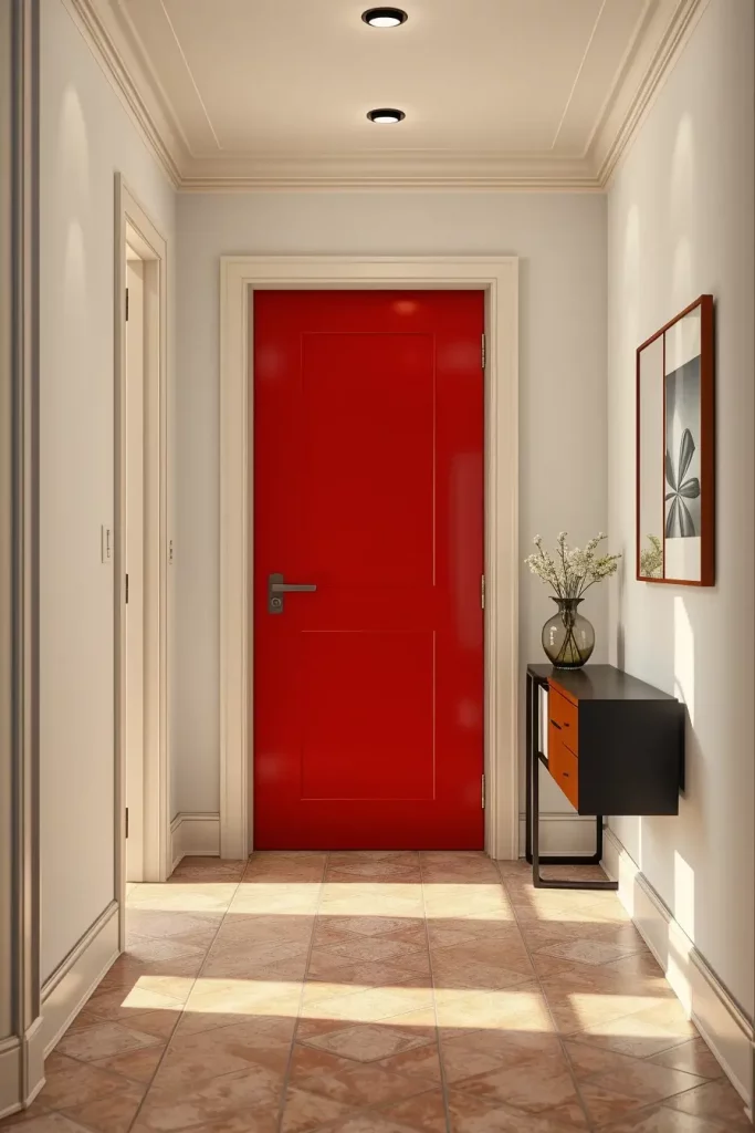 I tend to suggest a red door with neutral trim and plain hardware. Matte black or brushed brass handles are a perfect contrast to the red surface, without being distracting. The walls around the area must be kept lighter so that the red does not overpower the whole hallway.
