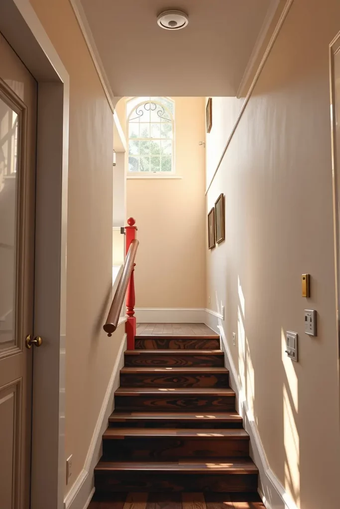 I prefer to combine warm red carpets with wooden furniture like a bench or a console table. The neutral walls in beige or cream make the flooring stand out, and wall sconces provide a warm light throughout the area. You can also use a runner rug with subtle red patterns that can also look beautiful instead of carpeting.