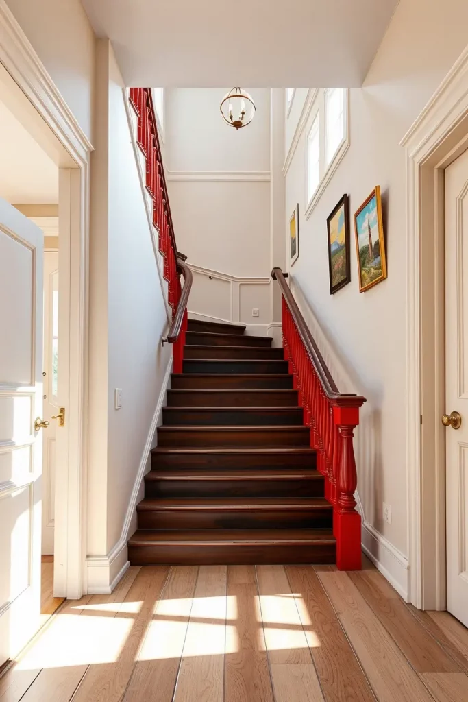 To execute, I usually suggest that only the railings or balusters be painted red and the treads and risers be neutral. This balance does not make the design look heavy. Contrasting the red railing with light-colored walls and dark stair treads makes the pairing feel bold, yet restrained.