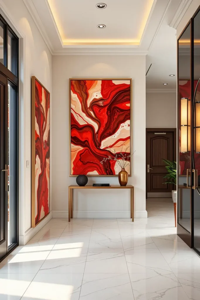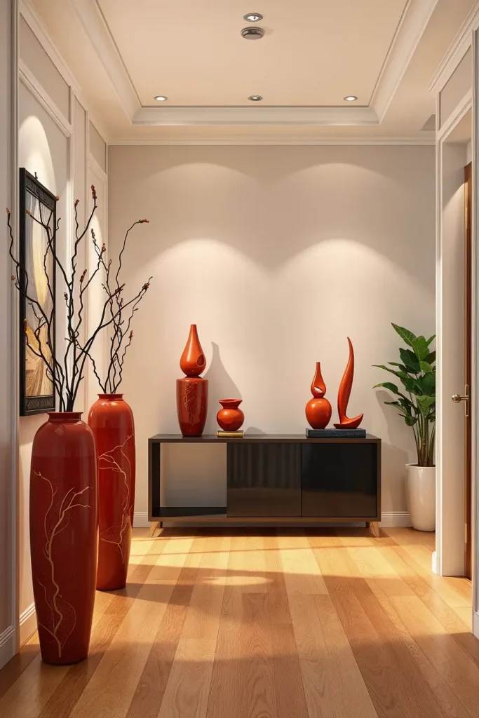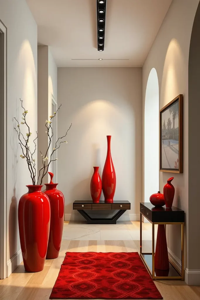 Red vases and sculptures can be used in the hallways that require some artistic touch, as well as supporting the accent color. I have used tall ceramic red vases or modern sculptures on console tables to give the hallway an instant curated look.
