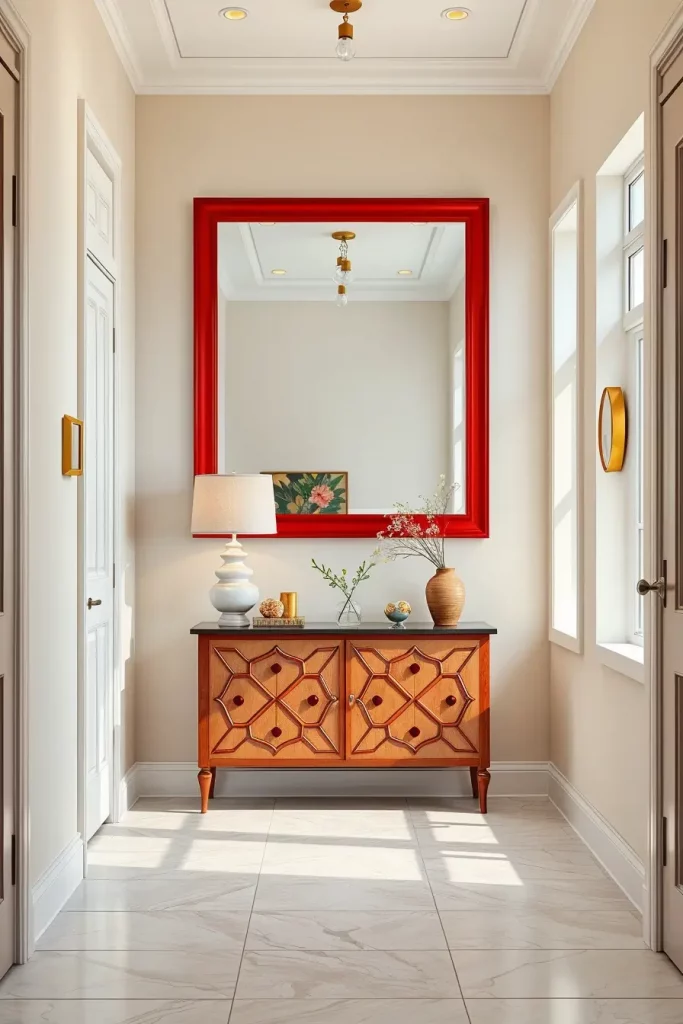 Mirrors are one of my favorite tools in the design of a hallway because they visually enlarge the room. Hanging them in a bright red color will serve two purposes: it will make the hallway look bigger and it will also serve as a decorative element. To give the illusion of width, I have put large red-framed mirrors opposite doorways to reflect the light.