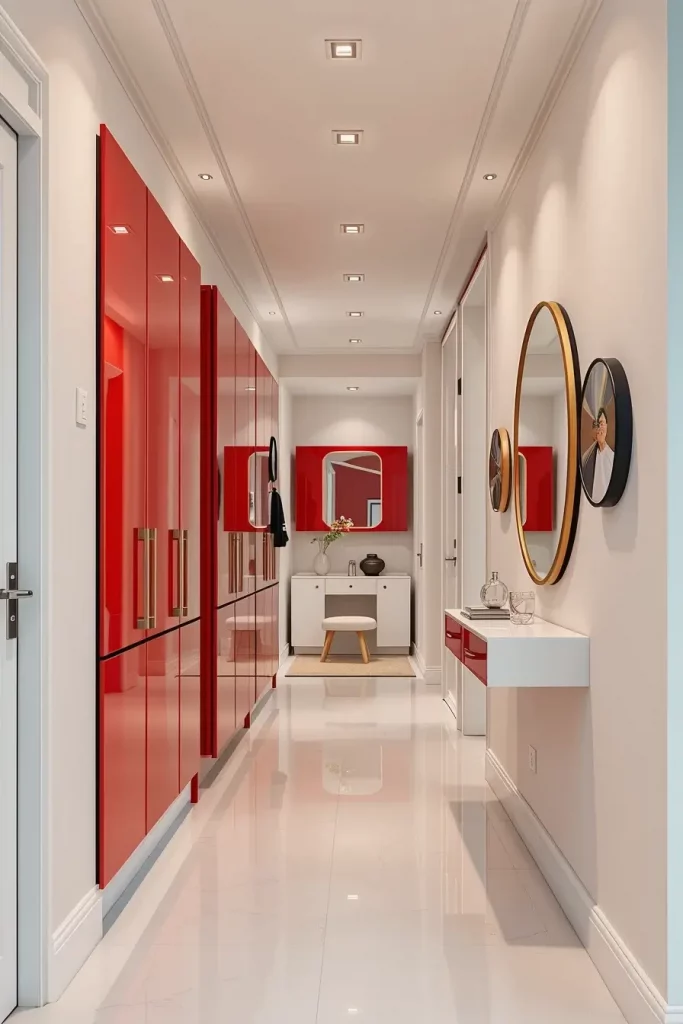 It is important to select the correct cabinet I will look at glossy finishes that reflect light, handles in matte black or chrome to provide contrast and the size of the product should be suitable to the size of the hallway. It is also possible to add a narrow console table in the same shade of red to tie the design together. A strategically positioned mirror above the cabinet enhances space and light, and this brings balance to a corridor that would otherwise feel congested.