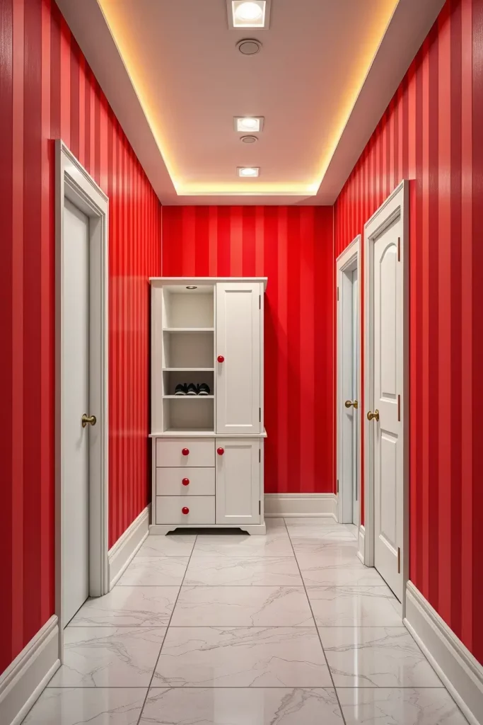 To add more effect, I prefer using painted stripes together with furniture with similar tones. Likewise, a white shoe cabinet with thin red handles or a red shelf that is mounted on the wall follows the stripe idea. Consistency is the key, so the accents do not seem to be an afterthought but an integrated design.