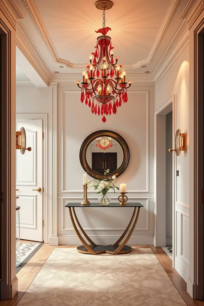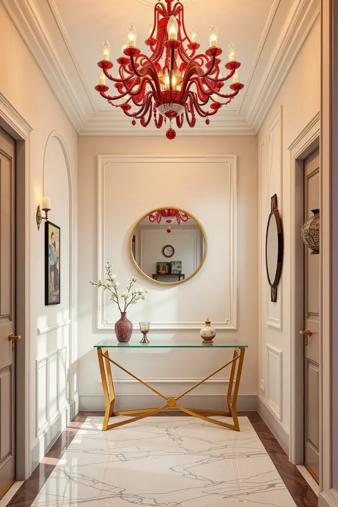 One of my favorite red decor in a hallway is lighting. A red chandelier instantly makes any plain corridor look dramatic and sophisticated, and the red chandelier transforms an otherwise ordinary corridor into a glamorous focal point. I like to use crystal or glass chandeliers with red tinted pieces that reflect the light in a beautiful way and give style and ambiance.