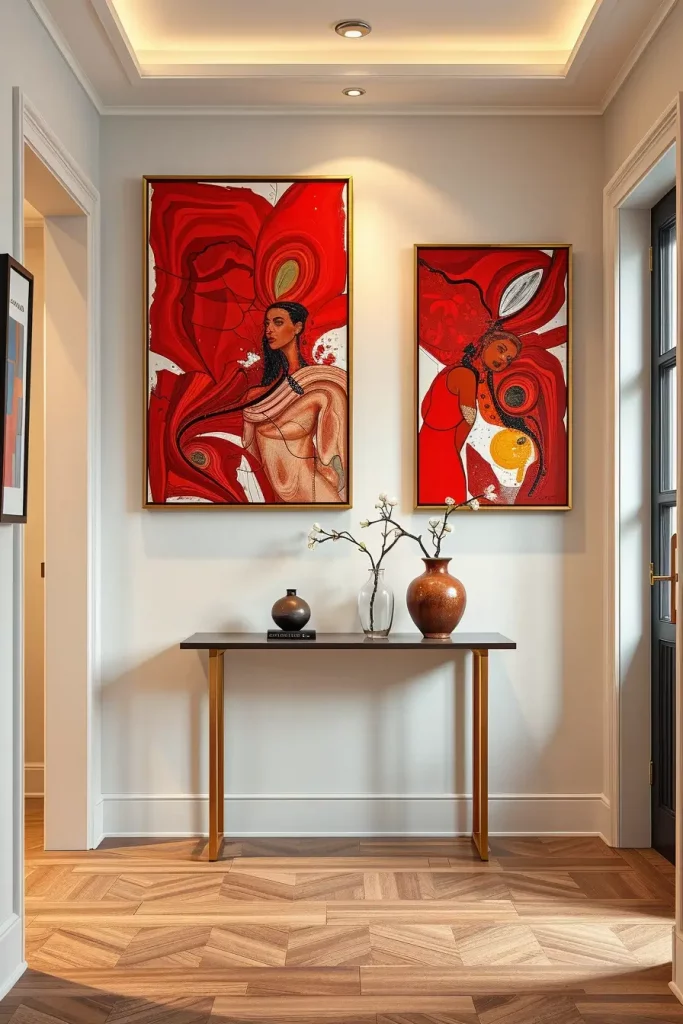 Geometric red wall art is a superb method of adding modernity and structure to a hallway. I have utilized big, bold canvases with red triangles, circles or abstract shapes to produce rhythm and flow in areas that would otherwise have been stagnant. Hallways, as transitional spaces, are very much enhanced by such visual stimulation.