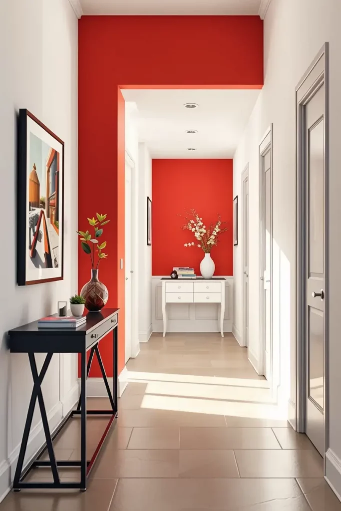 I find red accent walls to be a difficult wall color to use without being overdone. I normally recommend painting one side of the corridor or making a panel of red instead of painting the whole place. Architectural Digest has also emphasized that balance is the most important when working with bold tones, as accents should be contrasted with neutral flooring or trim.