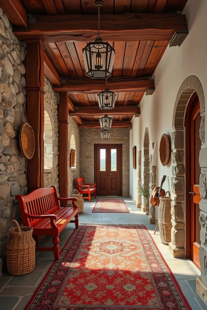 To add more to this appearance, I would suggest a woven basket or a patterned rug in red-and-earth hues. This unites the hallway and maintains the rustic feel of it.