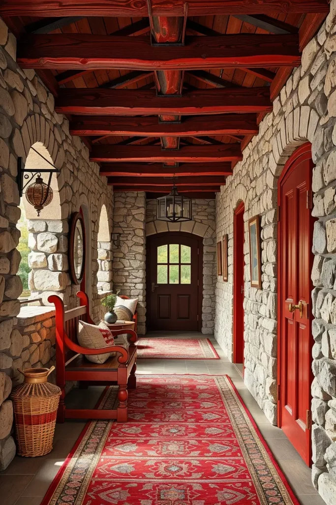 Red wooden elements can be used to make the hallway warmer and more rustic by homeowners who prefer such interiors. I have discovered that painting beams, trims or wooden consoles in deep red makes them look inviting and still retains the authenticity of rustic. The combination of natural textures and bright color is impressive, yet homey.
