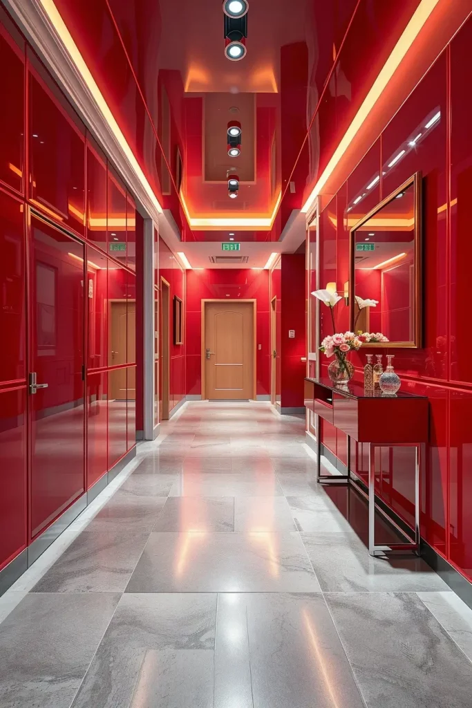 The glossy red looks best to my mind when paired with matte neutrals. Architectural Digest designers have pointed out that glossy finishes give a feeling of luxury and reflect both natural and artificial light, which gives depth. This has worked particularly well in small corridors.