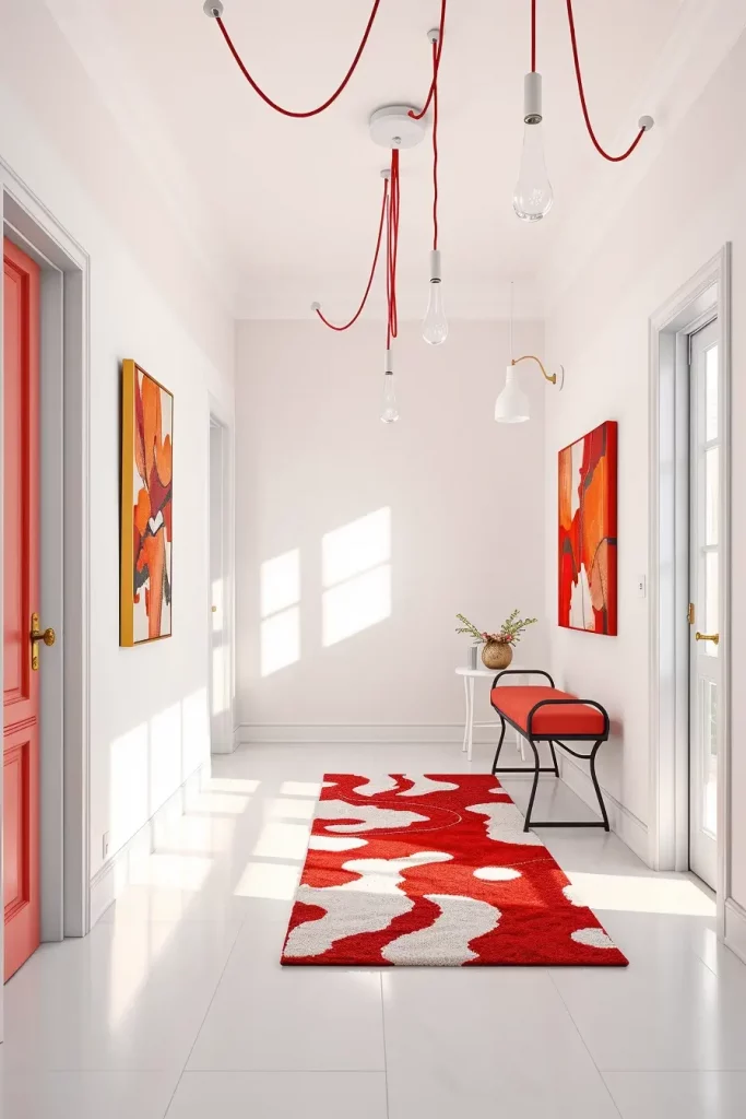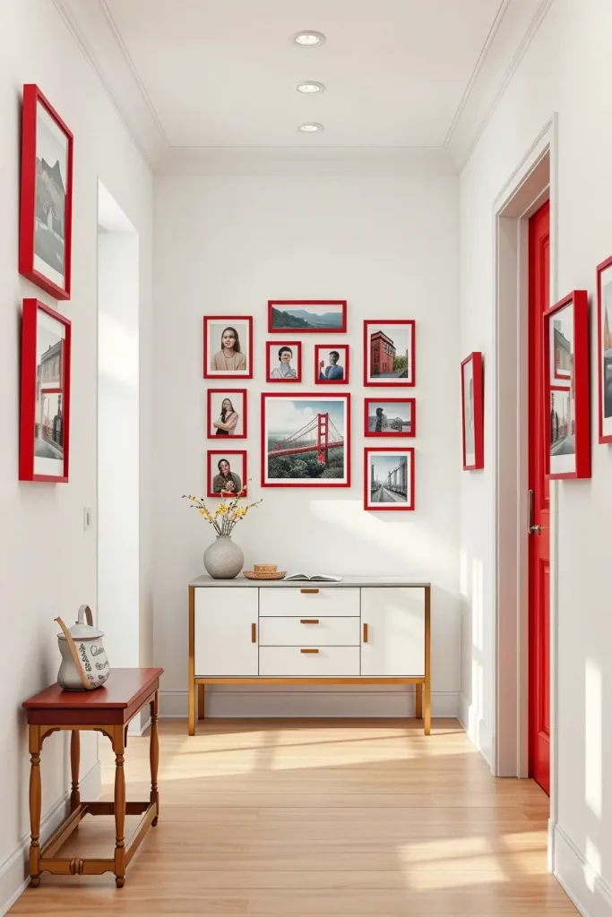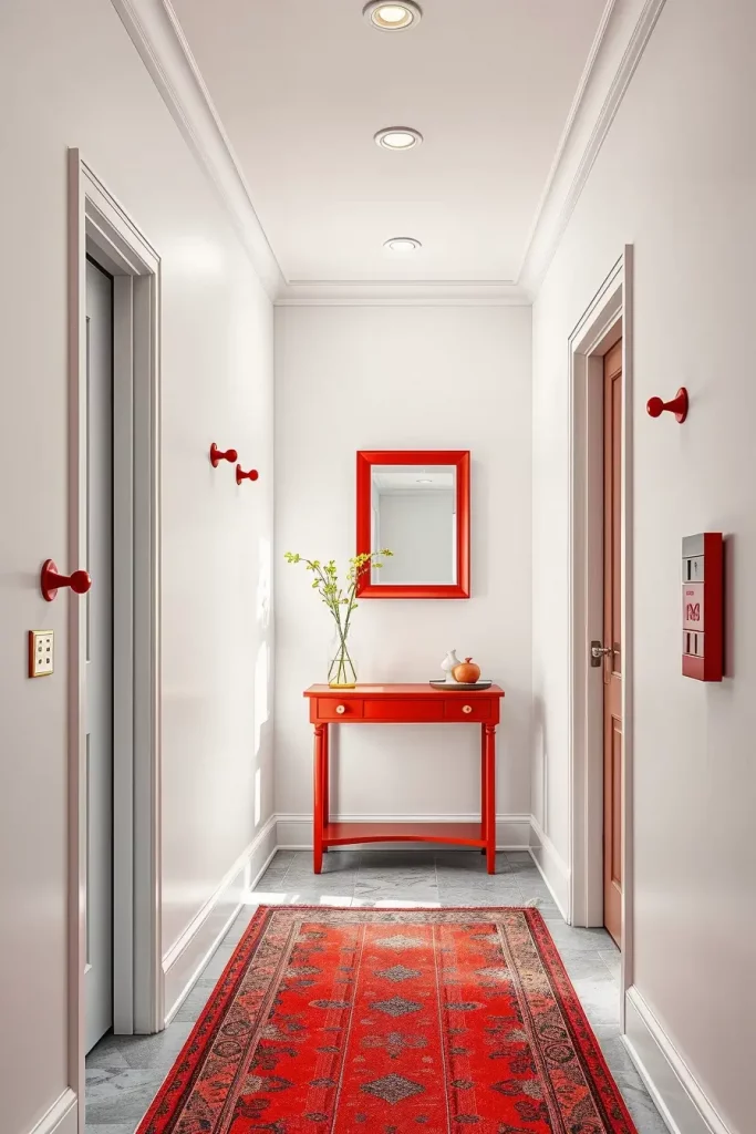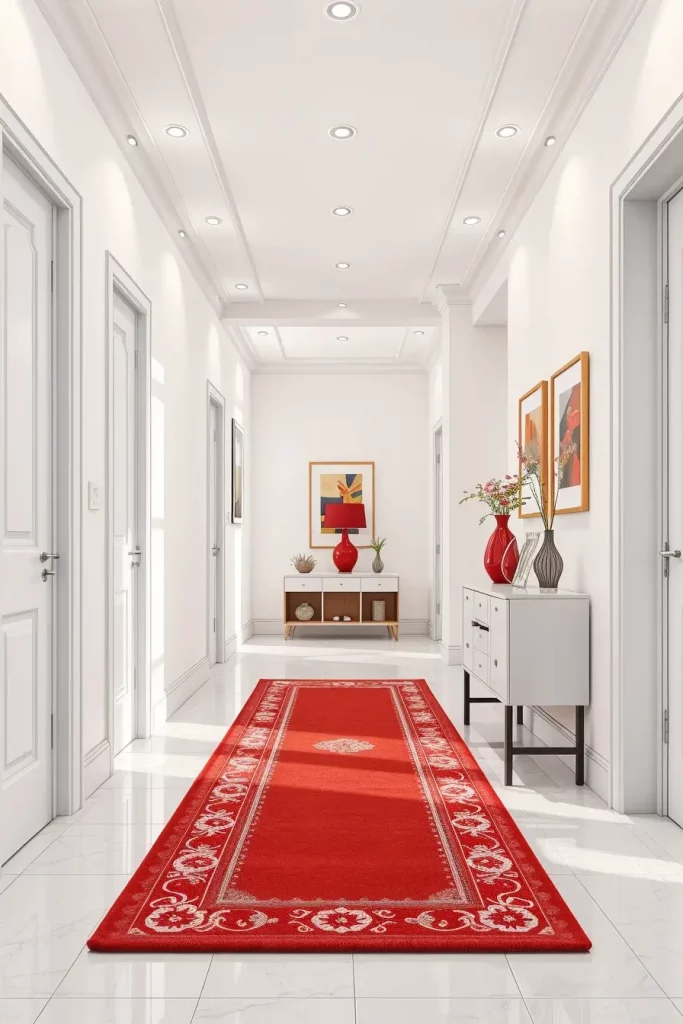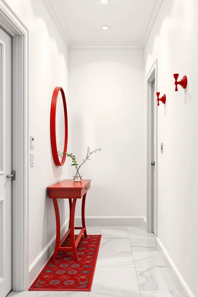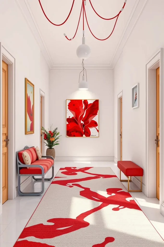The most appropriate method is to make the base neutral and red the hero. A red bench, a console with white drawers and red handles, or a red artwork in the frame can make the whole place. A red-and-white patterned rug will also add to the theme down the corridor.