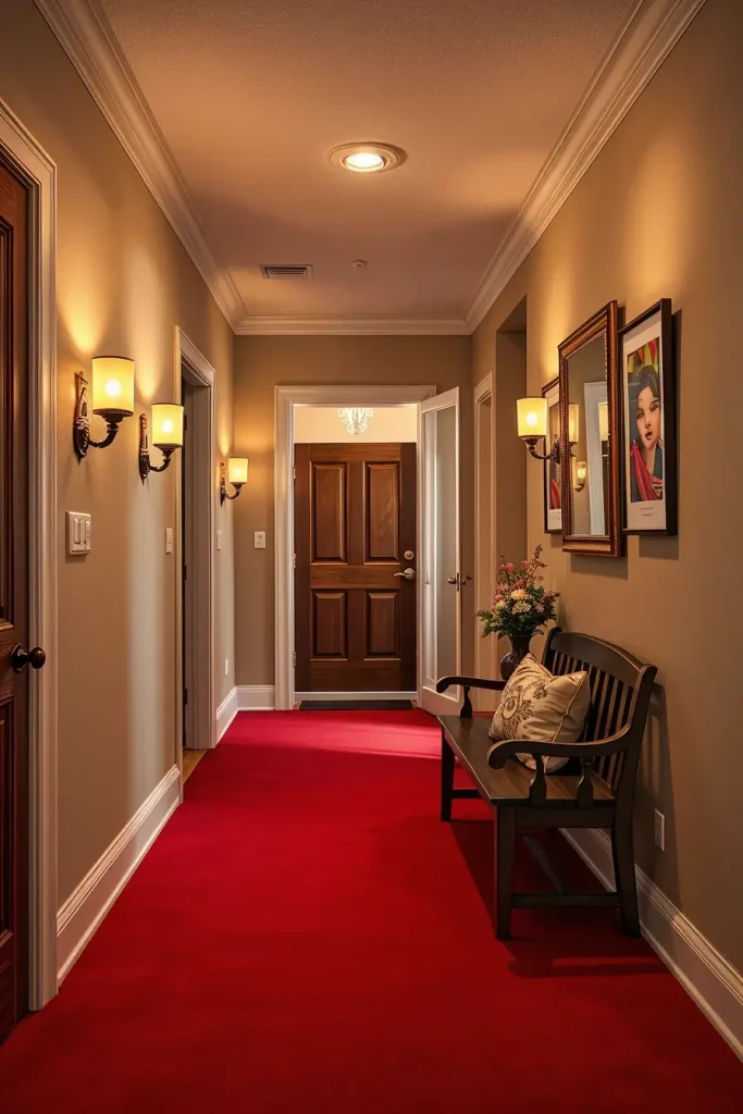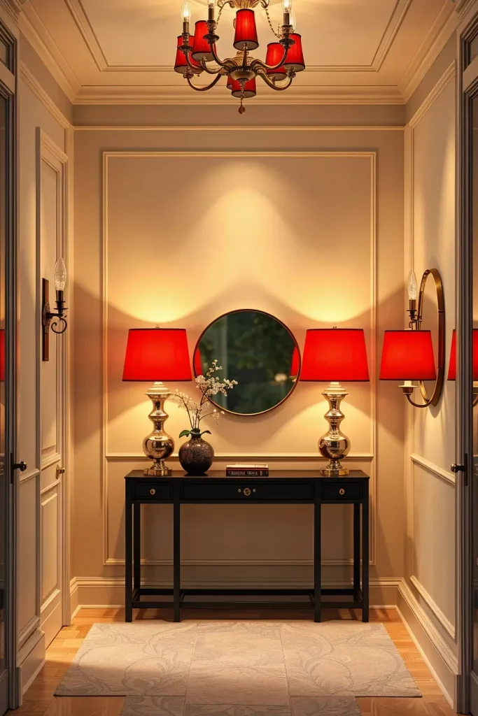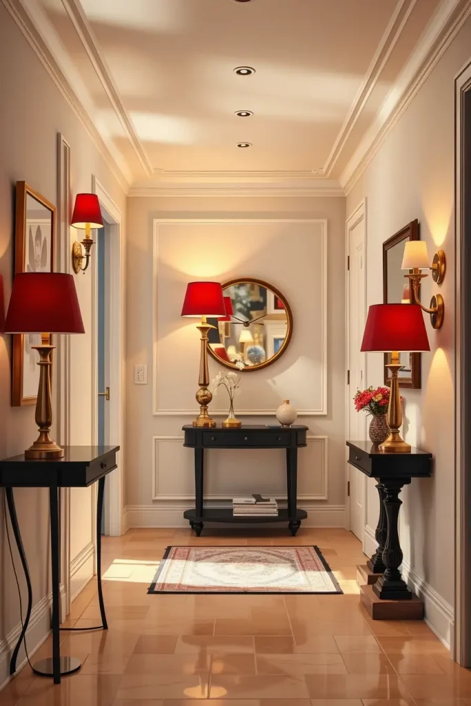 Lighting is an essential element of any interior, and red lamp shades will create a special touch of coziness and elegance to the hallway. I have frequently used red-shaded console lamps on entry tables, or even wall sconces with a little red glass, to add a dramatic glow that goes well with neutral walls.