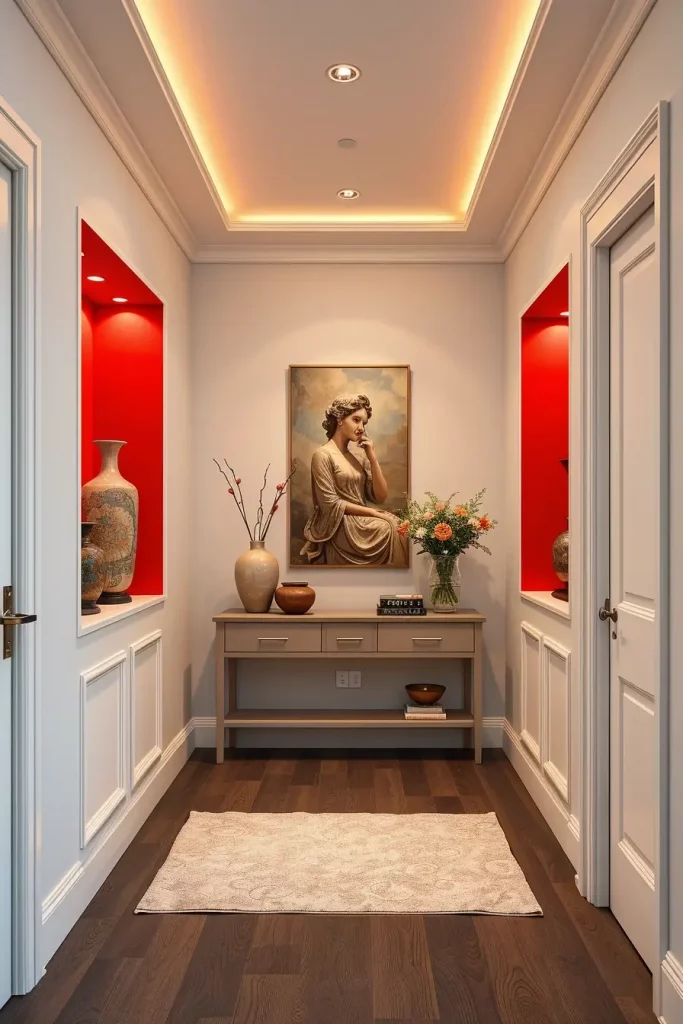 Niches built into the walls and painted in red accents can help to make a hallway look like a gallery. I prefer to use this design style because it will provide natural focal points and highlight decor objects such as sculptures, vases, or books. The red background is bold and makes all the objects presented to be visible.