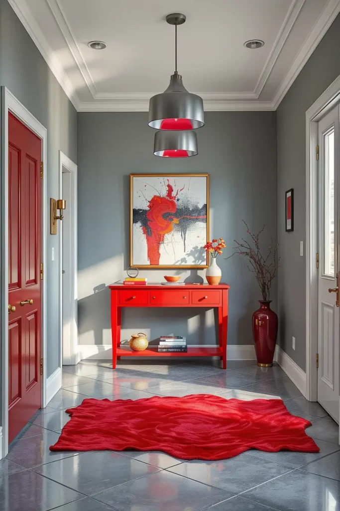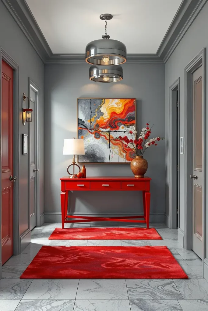 Furniture-wise, I would recommend gray walls with red console tables, or a gray bench with red throw pillows. Red accents and metallic gray lighting fixtures can also make harmony. The flooring is in soft gray and the bold red rug anchors the space.